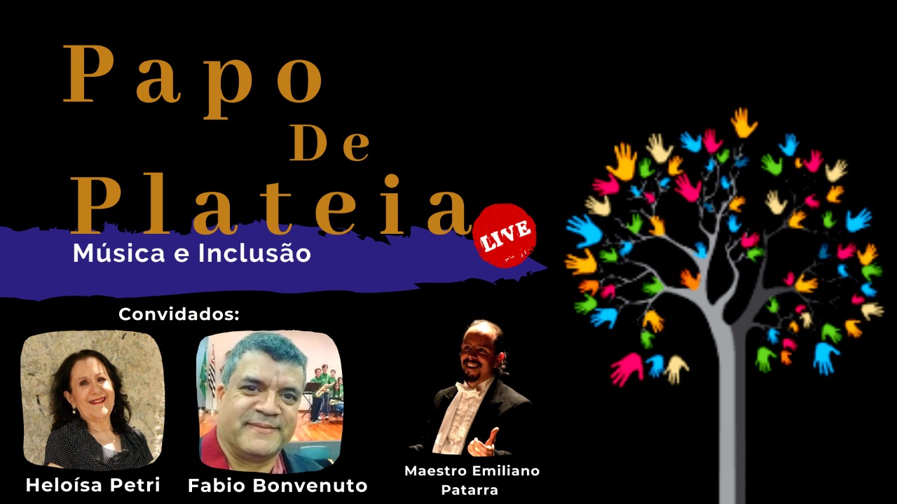 O Papo de Plateia Live desta quarta-feira (17), às 20h, convida especialistas em inclusão e educação musical para debater os temas. Iniciativa da Prefeitura de Guarulhos por meio da Secretaria de Cultura, o evento é transmitido pelas redes sociais das orquestras de Guarulhos no YouTube (https://www.youtube.com/channel/UCS9r_T3pJEr2wnZreRGSo1g), no Facebook (https://www.facebook.com/ojmguarulhos/) e no Instagram (https://www.instagram.com/orquestra.em.casa/).