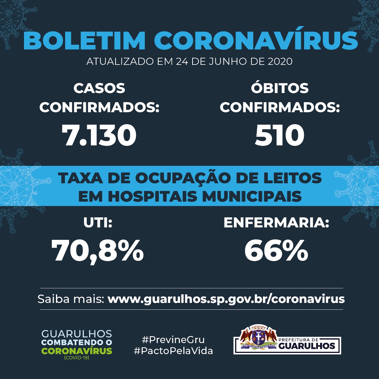 A taxa de ocupação dos leitos municipais direcionados para tratar pacientes com suspeita ou confirmação da Covid-19 está em 70,8% na UTI e 66% na enfermaria. No Centro de Combate ao Coronavírus (3C-Gru) 54 pessoas estão internadas, sendo 18 em UTI, 32 em enfermaria e quatro em observação. No local foram registrados um óbito e seis altas nesta quarta-feira.