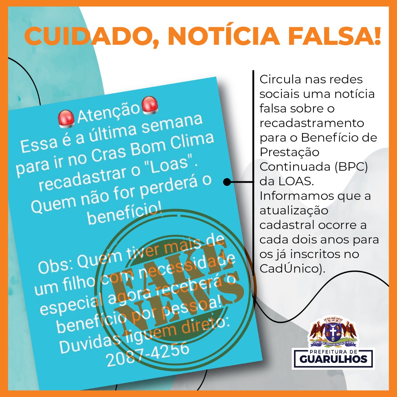 A Secretaria de Desenvolvimento e Assistência Social (SDAS) de Guarulhos alerta a população de que está circulando notícia falsa nas mídias sociais sobre o fim do prazo de recadastramento para o Benefício de Prestação Continuada (BPC) da Lei Orgânica da Assistência Social (Loas). A atualização cadastral ocorre a cada dois anos para os já inscritos no Cadastro Único para Programas Sociais (CadÚnico).