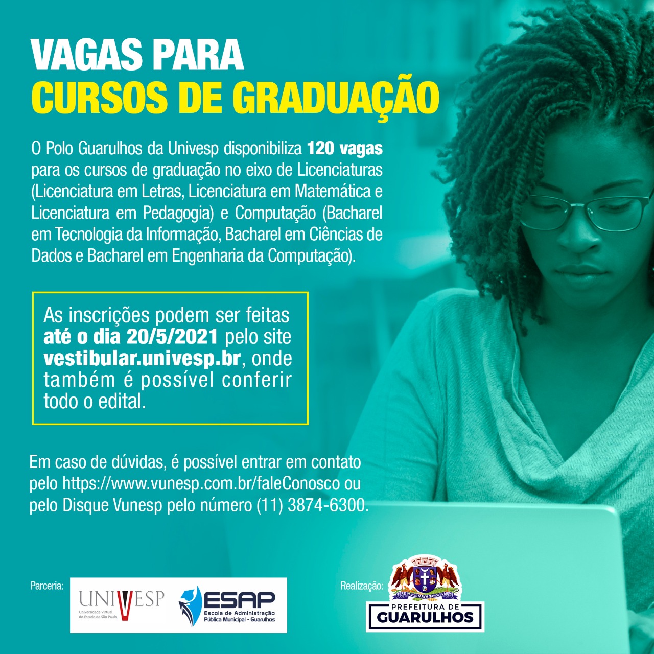 A Universidade Virtual do Estado de São Paulo (Univesp), em parceria com a Prefeitura, irá disponibilizar no Polo Guarulhos 120 vagas para cursos de graduação. Serão 60 vagas para o eixo de licenciaturas (letras, matemática e pedagogia) e 60 no eixo de computação (bacharel em tecnologia da informação, ciências de dados e engenharia da computação).