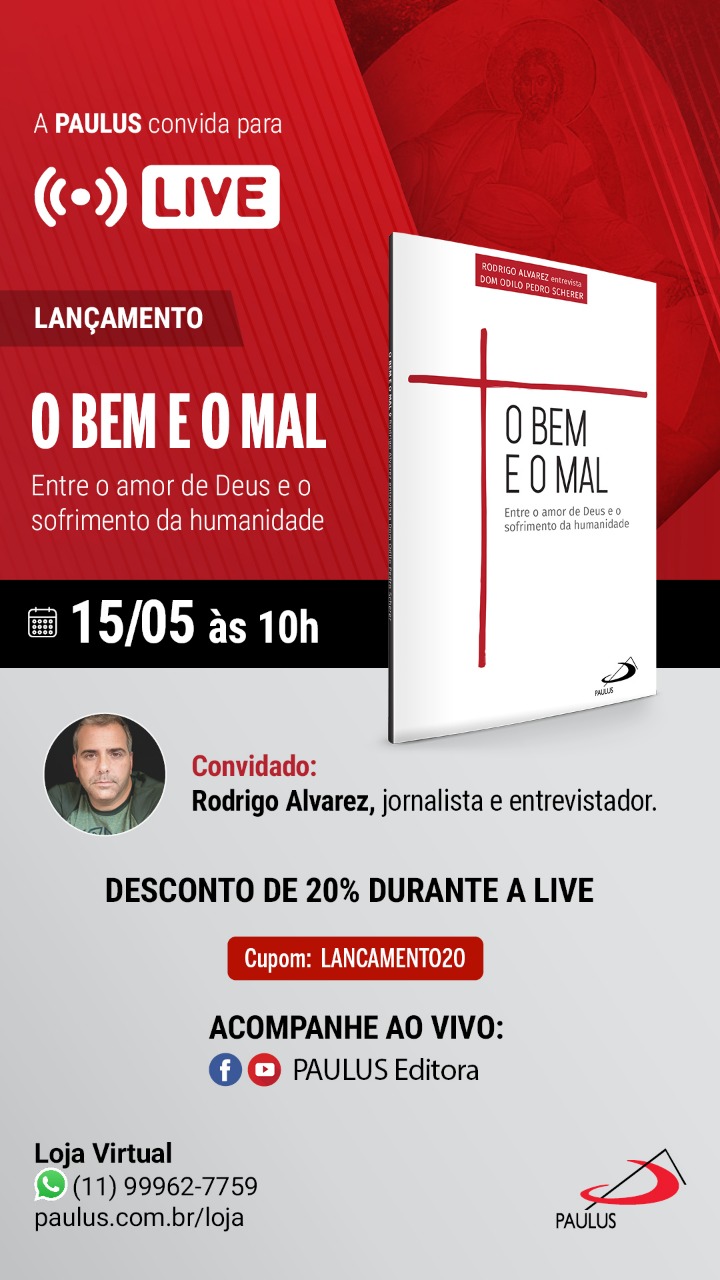 Neste sábado, dia 15 de maio, às 10h, a PAULUS Editora promove um bate-papo com o jornalista Rodrigo Alvarez, autor do livro “O bem e o mal – Entre o amor de Deus e o sofrimento da humanidade”. A conversa será transmitida através do Facebook e do YouTube da PAULUS Editora. Na ocasião, os espectadores poderão enviar suas perguntas para o convidado. Na obra, Alvarez entrevista Dom Odilo Pedro Scherer, arcebispo de São Paulo, sobre temas relevantes e atuais, como a influência da maldade do ser humano em diversas esferas da sociedade, a violência física e moral, as fake news, o mau uso das redes sociais, a globalização, o desenvolvimento social e a desigualdade. Rodrigo Alvarez é jornalista, formado pela Pontifícia Universidade Católica do Rio de Janeiro. Atuou como correspondente internacional da Rede Globo entre 2006 e 2019. É autor de diversos livros, com grande destaque para a temática religiosa.
