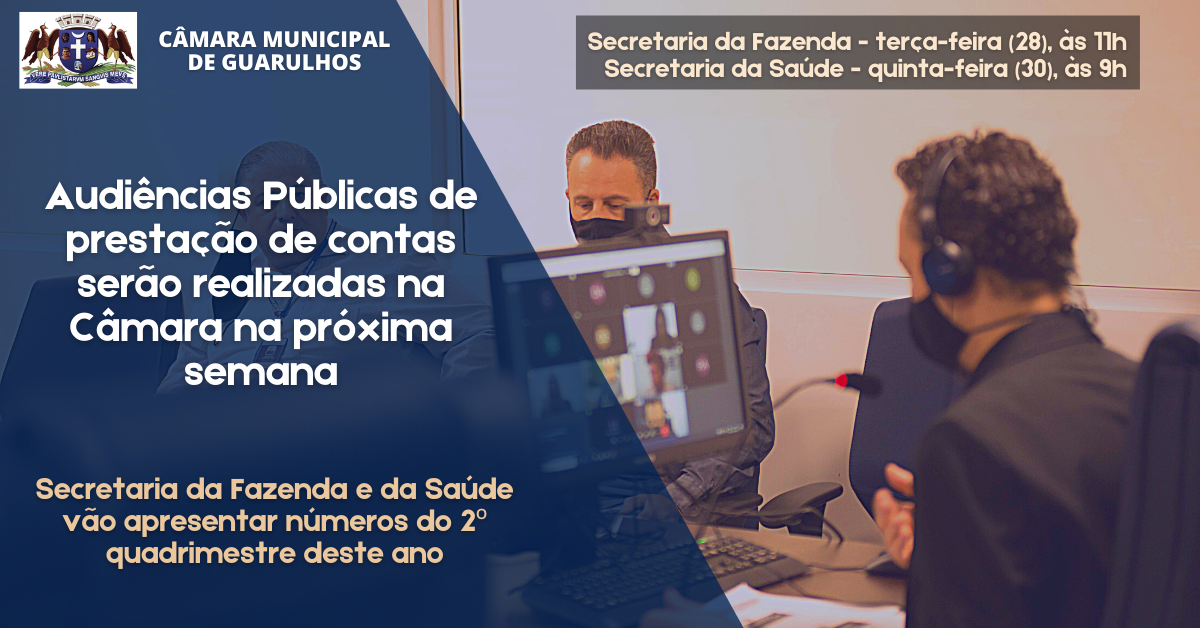 Imprensa CMG – Na próxima semana, a Câmara de Guarulhos será sede de duas Audiências Públicas de prestação de contas referentes aos meses de maio a agosto deste ano.