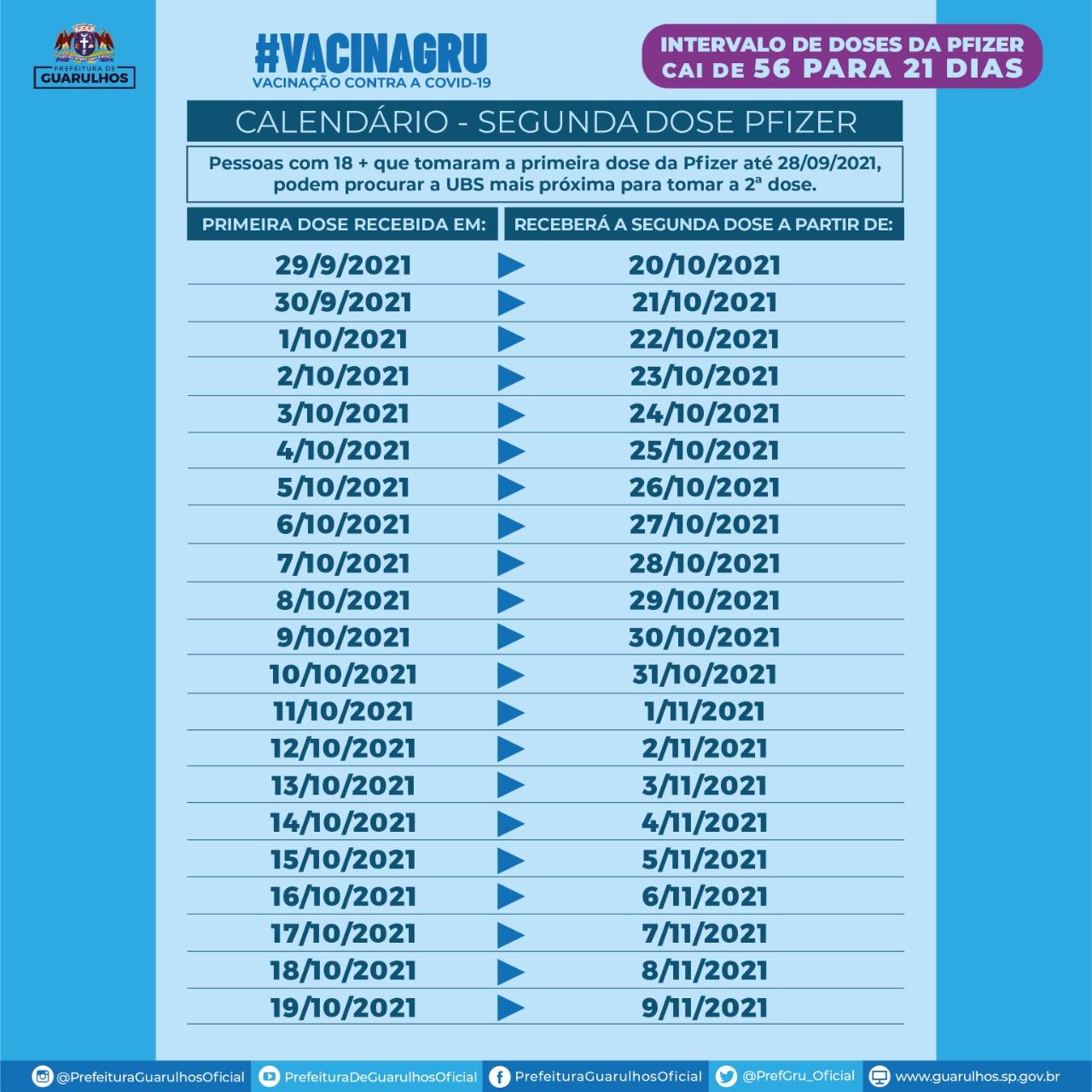 Até segunda-feira (18) 74.211 guarulhenses ainda não haviam tomado a segunda dose do imunizante da Pfizer, após o antigo prazo estabelecido (56 dias após a primeira dose). Para facilitar e reforçar a importância de completar o esquema vacinal no novo prazo, a Secretaria da Saúde elaborou a tabela (ao lado) com a data da primeira dose (D1), aquela anotada no cartão de vacinação, e a data em que deve ser tomada a segunda dose (D2).