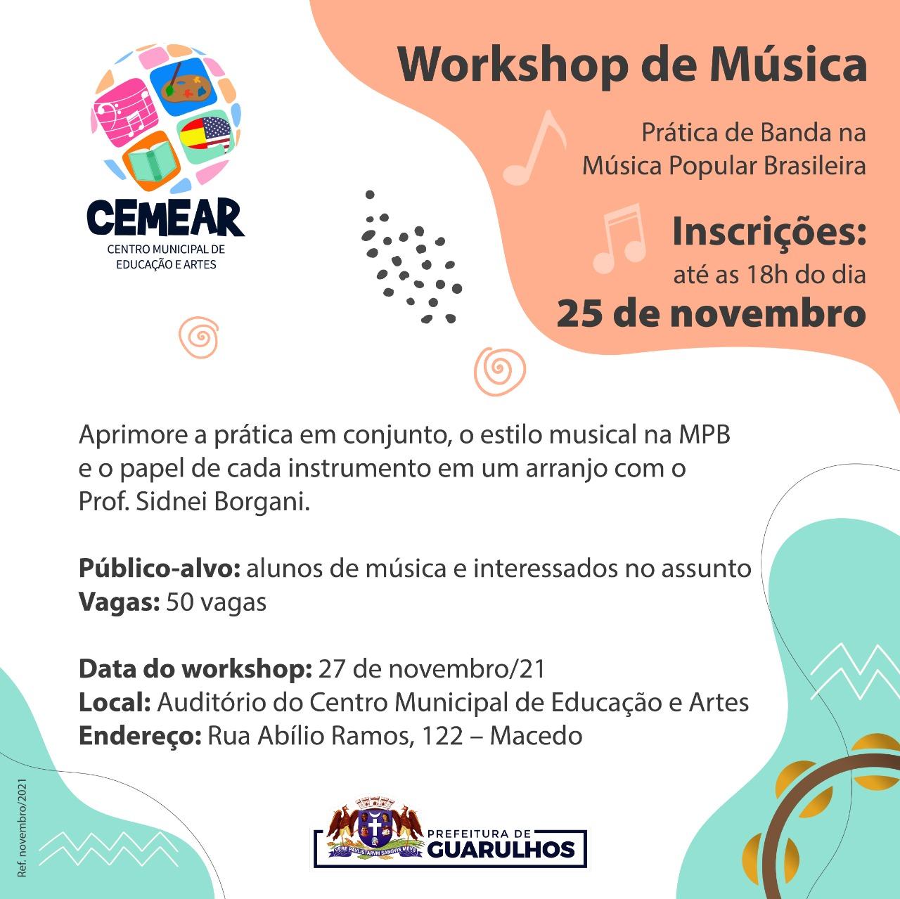 Promovido pela Prefeitura de Guarulhos, o workshop acontece no dia 27 de novembro (sábado), das 9h às 12h e das 13h às 16h, no auditório do Cemear. Para participar é necessária a inscrição pelo link bit.ly/WorkshopMúsicaGRU.