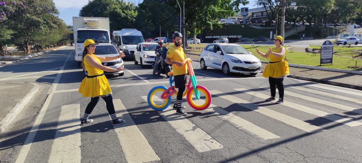 A avenida Monteiro Lobato, uma das mais movimentadas da cidade, recebeu na última quinta-feira (7) uma intervenção educativa voltada a pedestres. Durante todo o dia, atores especialmente caracterizados em companhia de um carro de som circularam pelo endereço fazendo paradas nos pontos de travessia para chamar a atenção dos transeuntes sobre os riscos de atravessar vias fora da faixa de pedestres, da não observância da sinalização semafórica e também de hábitos cada vez mais comuns, como a distração com o uso de celular e de fones de ouvido.