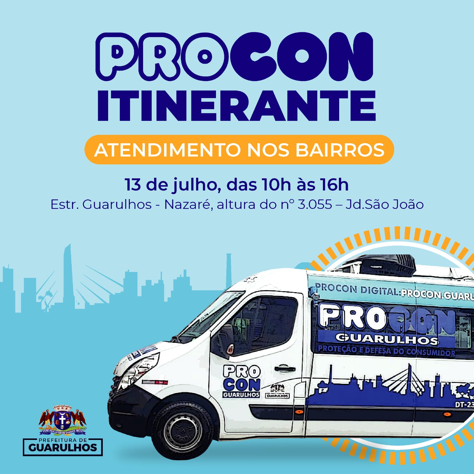A van da Coordenadoria de Proteção e Defesa do Consumidor de Guarulhos atenderá a população do Jardim São João nesta quarta-feira (13), das 10h às 16h, na estrada Guarulhos-Nazaré, altura do número 3.055.