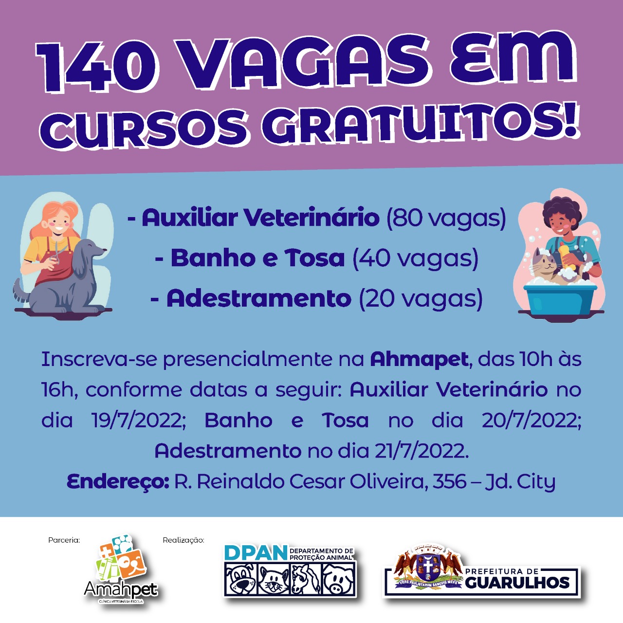 A Prefeitura de Guarulhos, em parceria com a Amah Cursos Profissionalizantes, oferece 140 vagas em cursos gratuitos para quem quiser atuar no mercado pet. São 80 vagas para auxiliar de veterinário (81 horas), 40 para banho e tosa (50 horas) e 20 para adestramento (45 horas). Para se inscrever é necessário morar em Guarulhos, ser maior de 16 anos e ter o ensino fundamental completo.