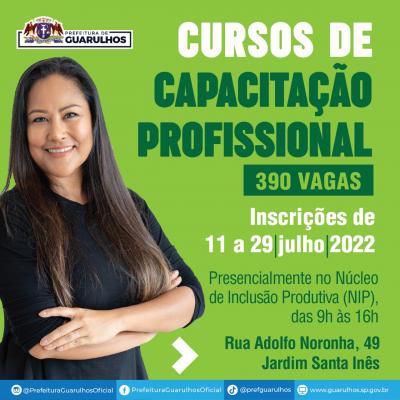 A Prefeitura de Guarulhos receberá até o dia 29 de julho as inscrições para 390 vagas em cursos de capacitação profissional do Núcleo de Inclusão Produtiva (NIP). Os interessados devem comparecer à rua Adolfo Noronha, 49, Jardim Santa Inês, das 9h às 16h, munidos de cópias do RG, do CPF, de um comprovante de residência e do Cadastro Único para Programas Sociais (CadÚnico), além de informar um número de telefone atualizado.