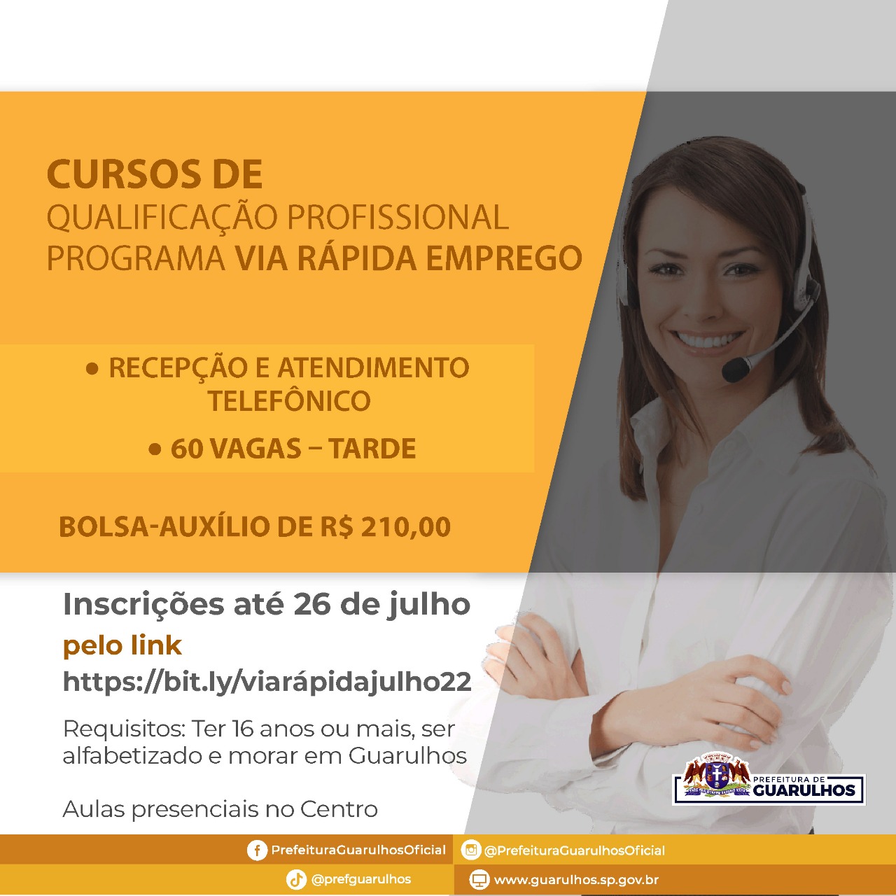 Estão abertas as inscrições para as 60 vagas do curso de recepção e atendimento telefônico em Guarulhos. Os interessados têm até o dia 26 de julho para se inscrever pelo link https://bit.ly/viarápidajulho22. A iniciativa é uma parceria entre a Prefeitura e o governo do Estado de São Paulo por meio do Programa Via Rápida.