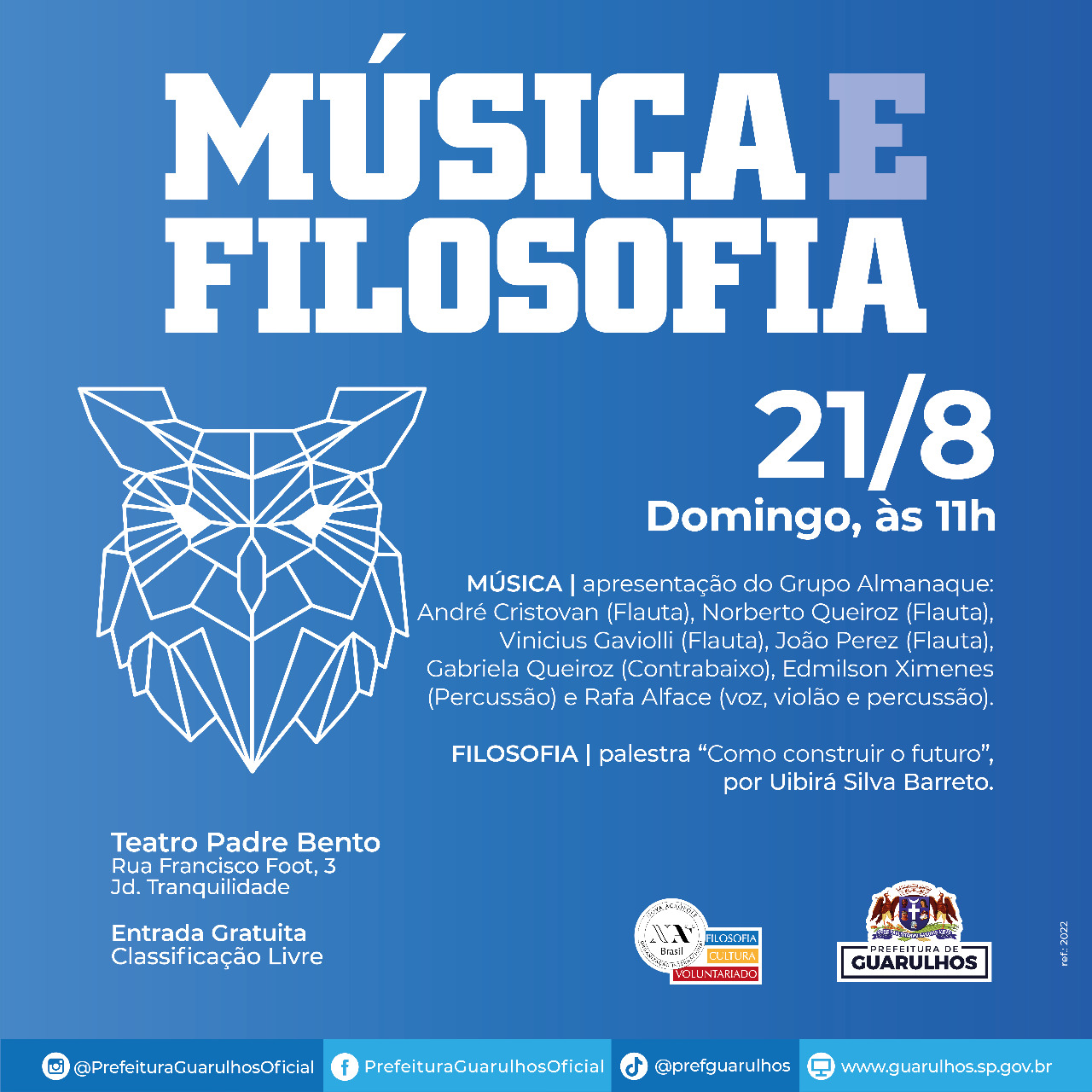 No próximo domingo (21), às 11h, o Teatro Padre Bento recebe encontro do projeto Música e Filosofia com o tema Como Construir o Futuro, com o palestrante Uibirá Silva Barreto, diretor da organização Nova Acrópole. O evento é uma oportunidade para que os participantes troquem experiências e aprofundem os estudos de formação humanística. A entrada é gratuita e a classificação, livre.