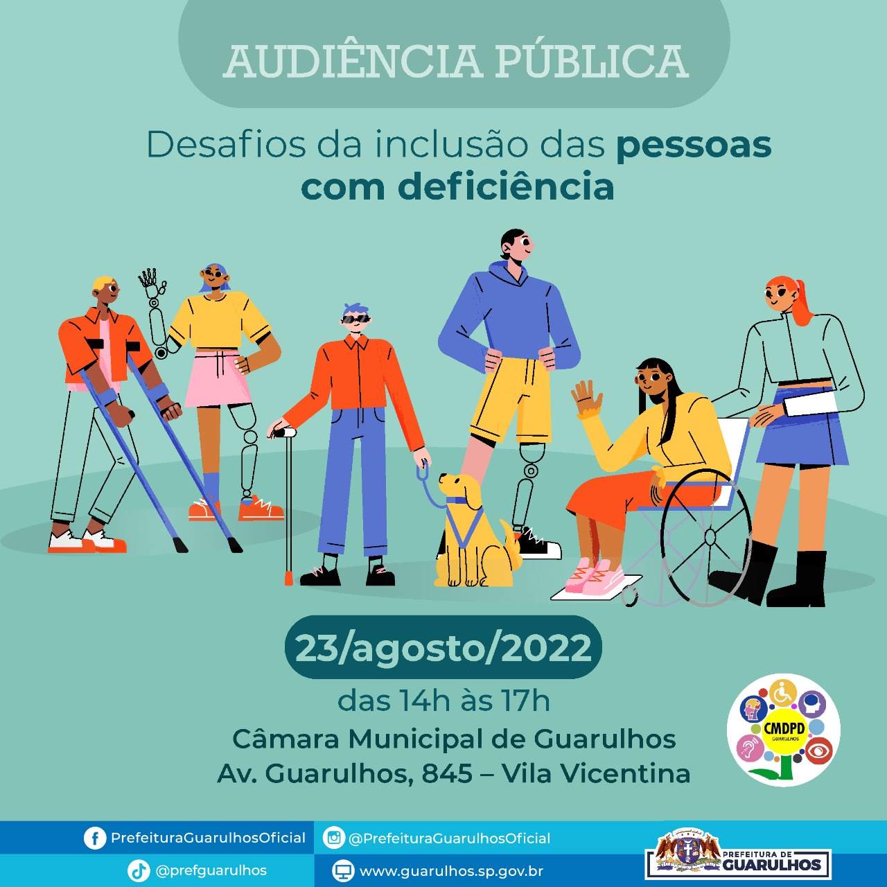 O Conselho dos Direitos da Pessoa com Deficiência (CMDPD) de Guarulhos realizará na próxima terça-feira (23), das 14h às 17h, uma audiência pública na Câmara Municipal (avenida Guarulhos, 845, Vila Vicentina). O encontro, que é aberto a toda a população, tem como tema Desafios da Inclusão das Pessoas com Deficiência – A Implementação de Políticas Públicas para a Inclusão.