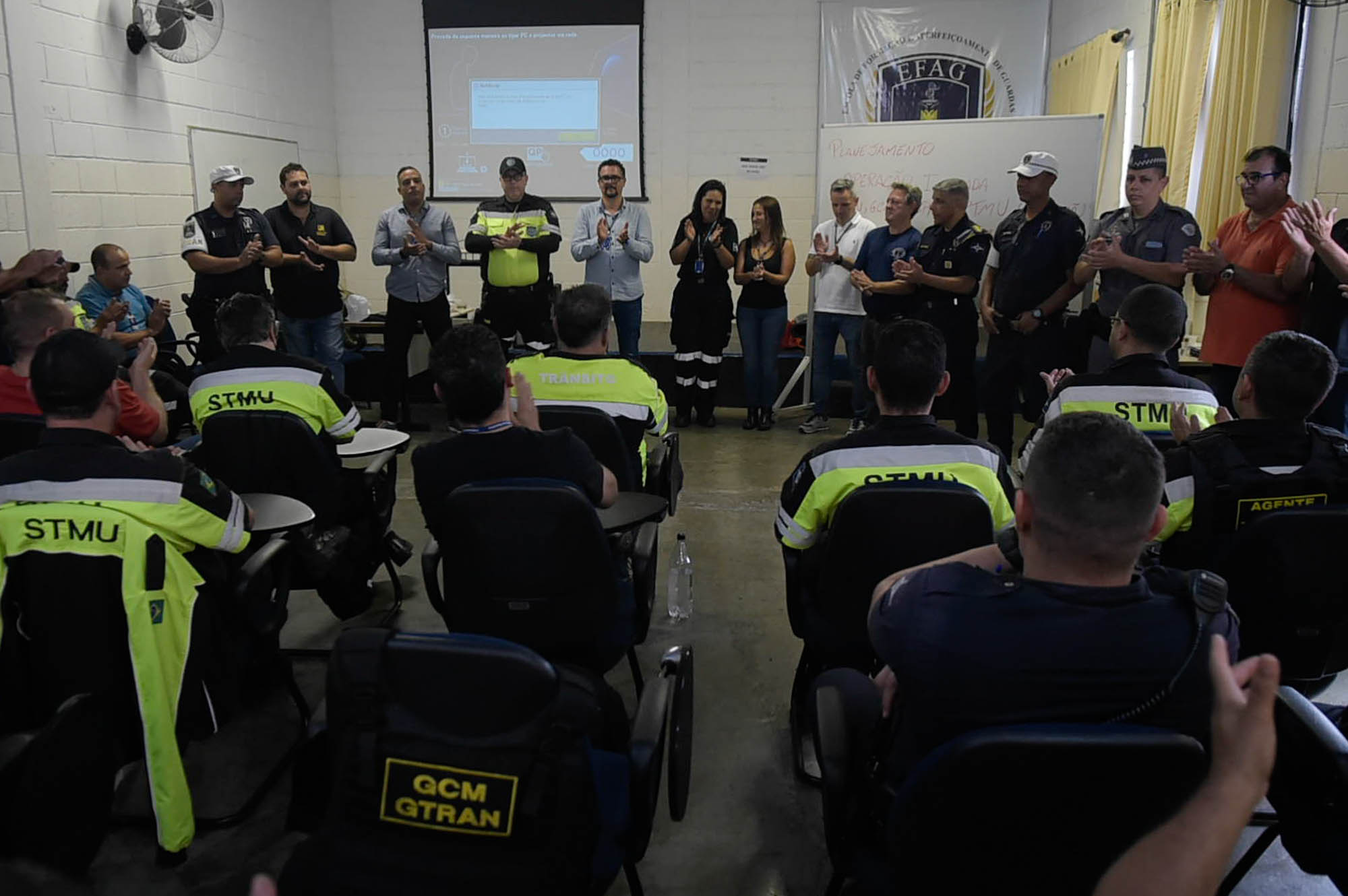 A terceira turma de agentes de transportes e trânsito, guardas civis municipais, policiais militares e representantes da Junta Administrativa de Recursos de Infrações (Jari) de Guarulhos concluiu nesta quinta-feira (18) formação sobre atualização de legislação de trânsito, ética, cidadania, operação e fiscalização, realizada na Escola de Formação e Aperfeiçoamento de Guardas (Efag), na Ponte Grande. No total, 62 servidores participaram da formação.