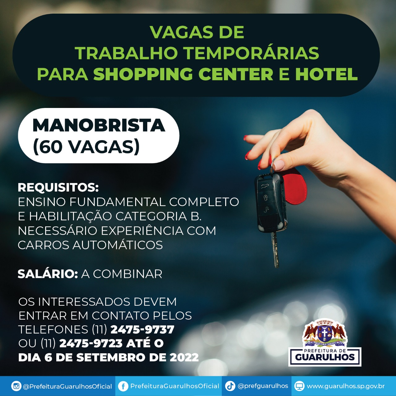 O Centro Integrado de Emprego, Trabalho e Renda (Ciet), agência pública de empregos da Prefeitura de Guarulhos, receberá até a próxima terça-feira (6) as candidaturas dos interessados em preencher as 60 vagas disponíveis para trabalhar como manobrista. Os pretendentes devem entrar em contato pelos telefones da Secretaria do Trabalho: (11) 2475-9737 ou (11) 2475-9723.
