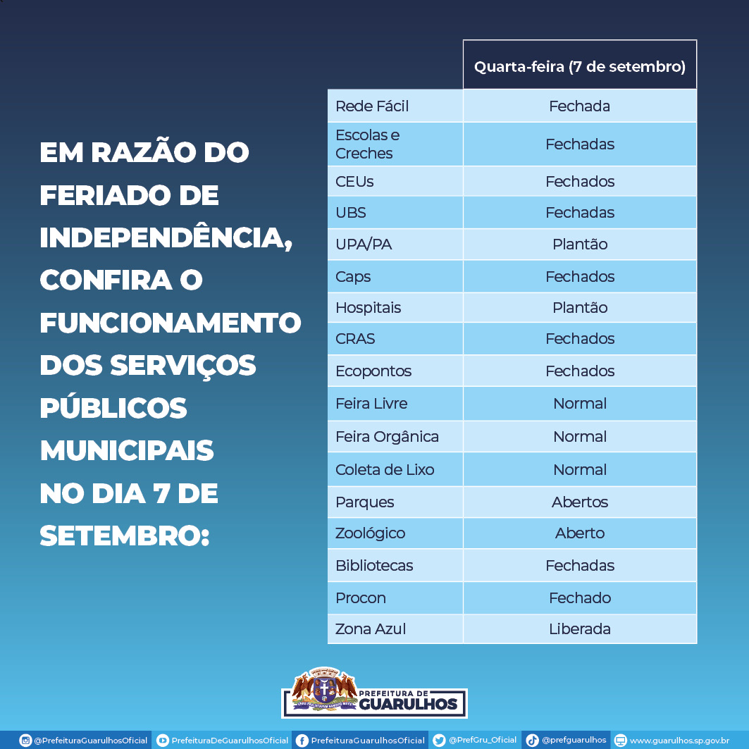 A Prefeitura de Guarulhos informa, em tabela anexa, como será o funcionamento dos serviços públicos no feriado desta quarta-feira (7) em que se comemora o Bicentenário da Independência do Brasil.