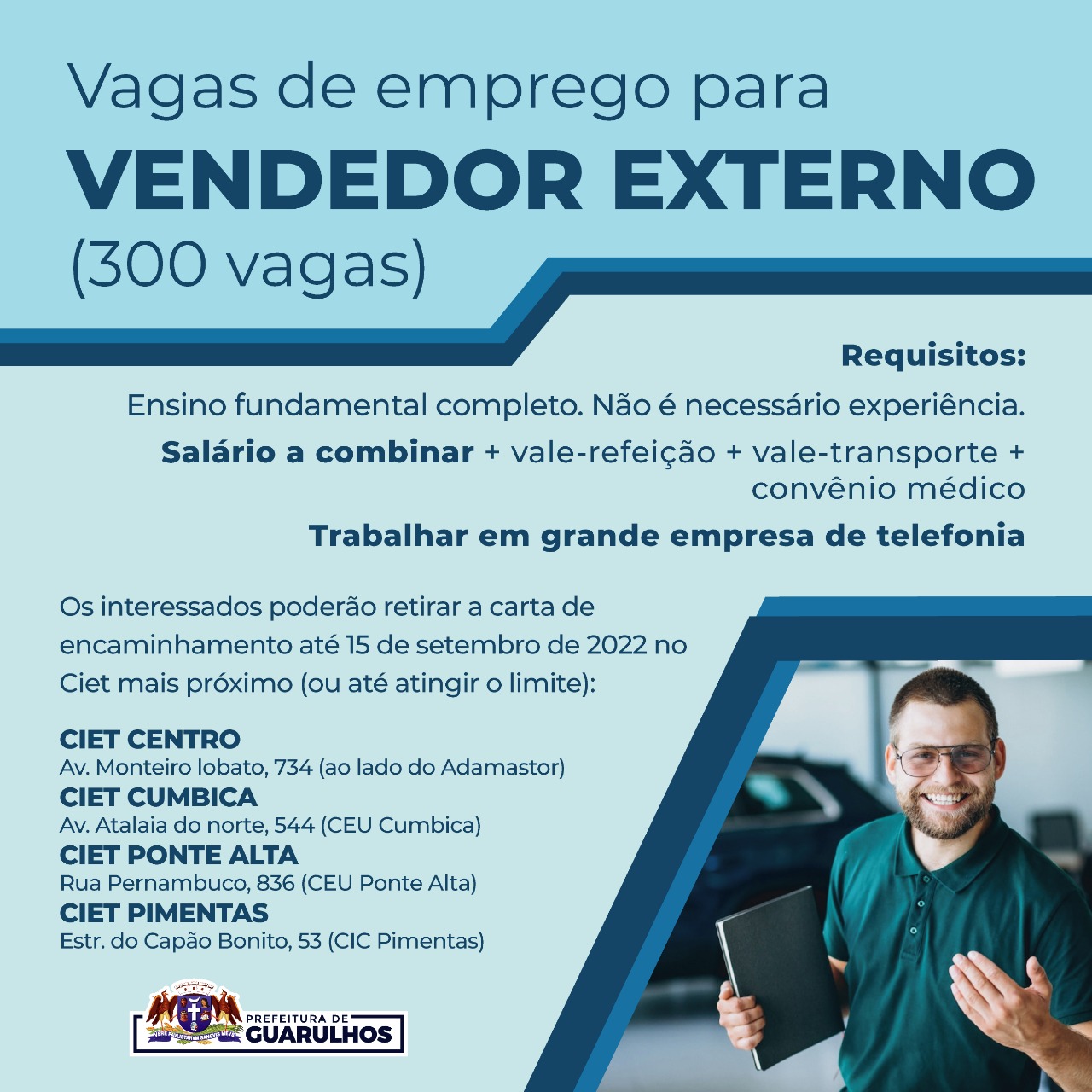 O Centro Integrado de Emprego, Trabalho e Renda (Ciet) de Guarulhos receberá até o dia 15 de setembro as candidaturas para 300 vagas de trabalho para vendedor externo. Elas são oferecidas por uma empresa parceira da Secretaria do Trabalho e os selecionados irão trabalhar na área de telefonia.