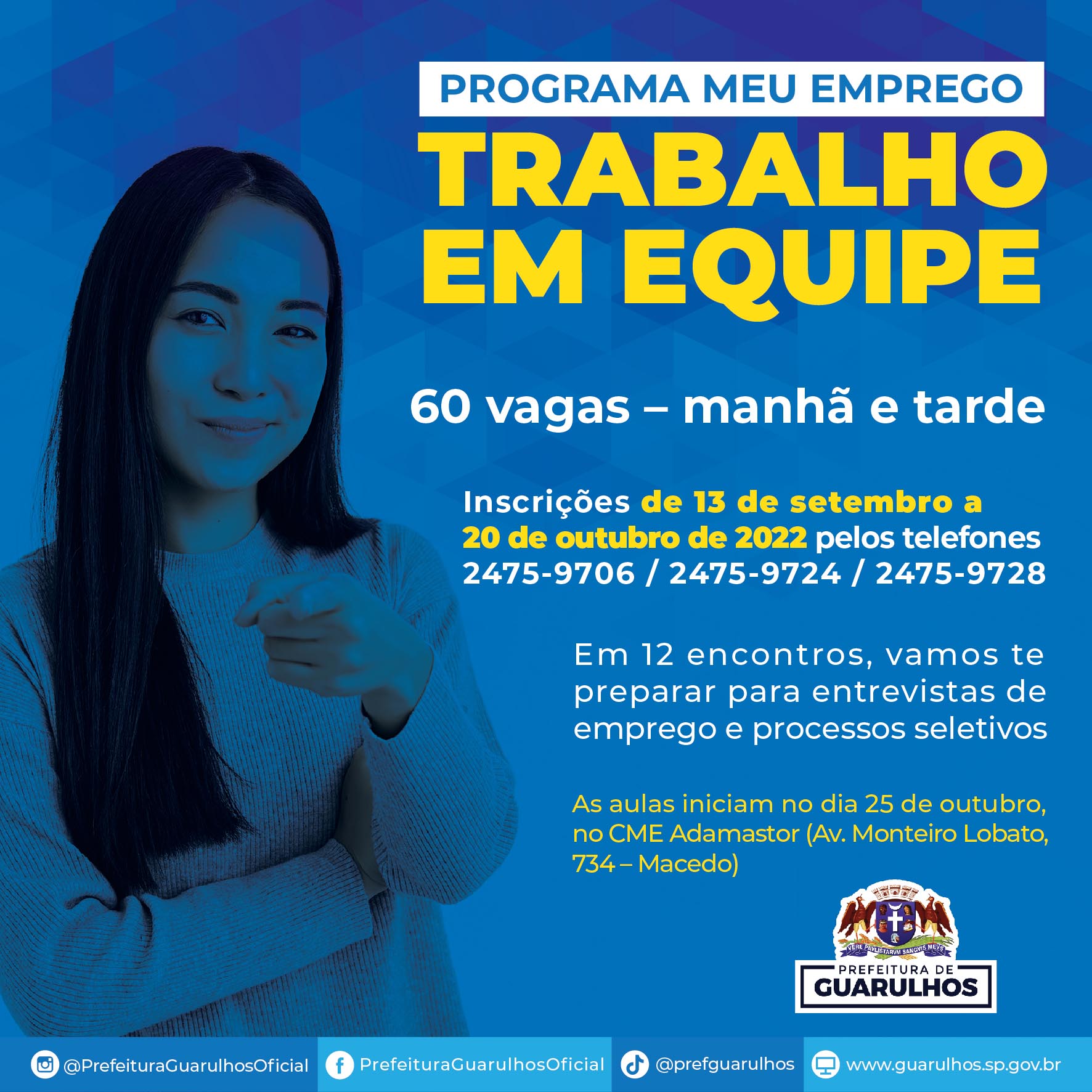 A Prefeitura de Guarulhos recebe até esta quinta-feira (20) inscrições para o Trabalho em Equipe – Programa Meu Emprego, programa de orientação de jovens e adultos sobre processos seletivos na busca por uma oportunidade de trabalho. São 60 vagas divididas entre os períodos manhã e tarde e os interessados devem entrar em contato pelos telefones 2475-9706, 2475-9724 ou 2475-9728.