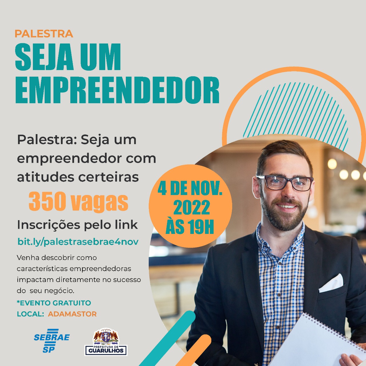A palestra “Seja um Empreendedor com Atitudes Certeiras” está com inscrições abertas até o próximo dia 3 de novembro. São 350 vagas oferecidas gratuitamente pela Prefeitura de Guarulhos, em parceria com o Serviço Brasileiro de Apoio às Micro e Pequenas Empresas (Sebrae). Os interessados devem realizar cadastro e se inscrever no link bit.ly/palestrasebrae4nov.