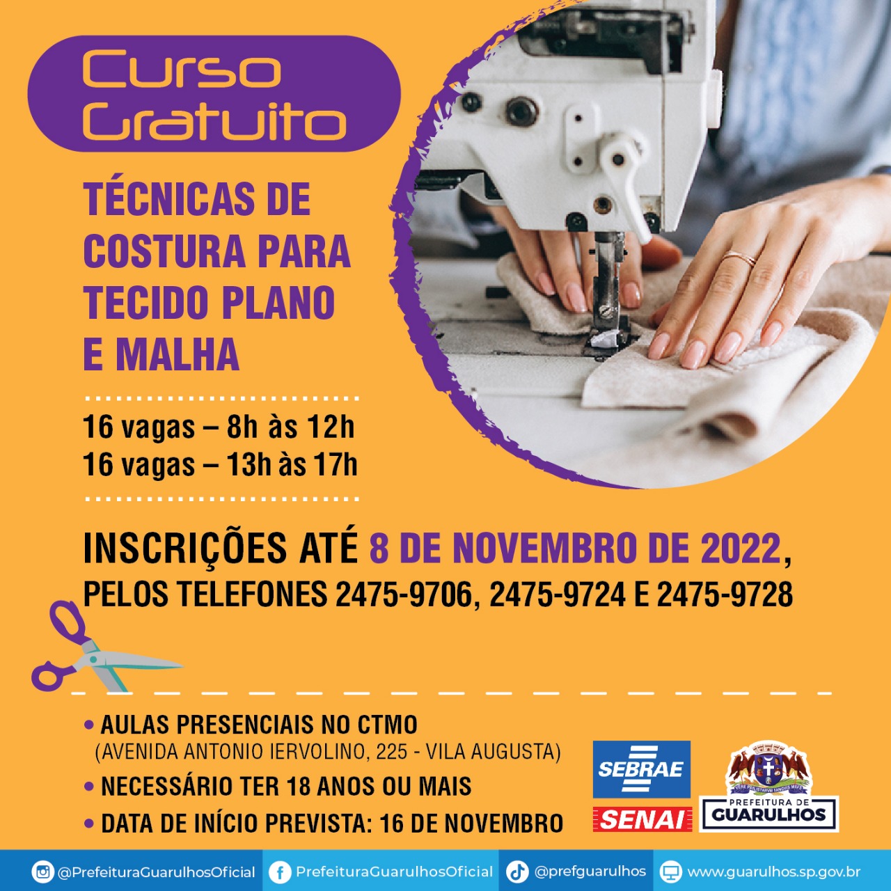 A Prefeitura de Guarulhos receberá até terça-feira (8) as inscrições para o curso gratuito de técnicas de costura para tecido plano e malha. São 16 vagas para aulas no período da manhã, das 8h às 12h, e mais 16 para a tarde, das 13h às 17h. Os interessados devem entrar em contato pelos telefones 2475-9706, 2475-9724 e 2475-9728, da Secretaria do Trabalho, que oferece a formação em parceria com o Serviço Brasileiro de Apoio às Micro e Pequenas Empresas (Sebrae) e com o Serviço Nacional de Aprendizagem Industrial (Senai).