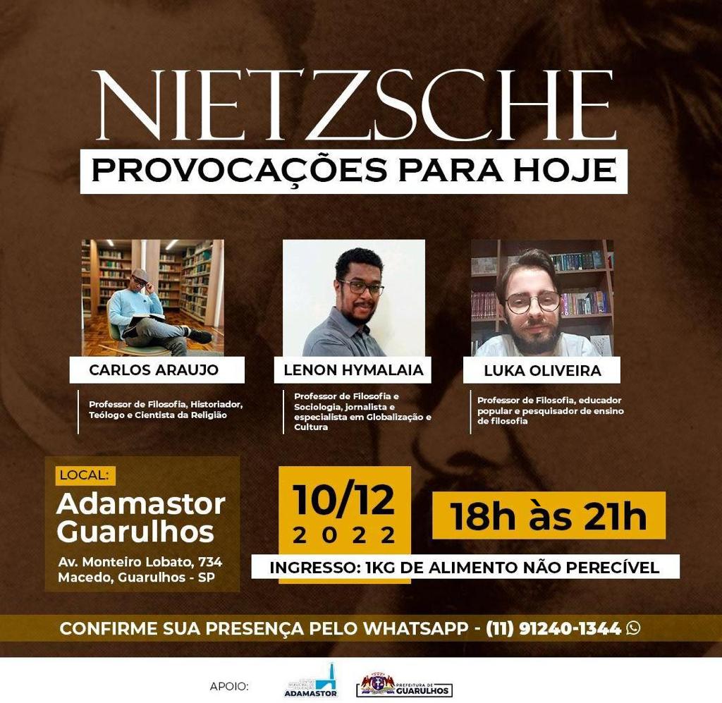 O Teatro Adamastor (avenida Monteiro Lobato, 734, Macedo) será palco neste sábado (10), das 18h às 21h, do debate Nietzsche, Provocações para Hoje, que contará com as participações do professor de filosofia, história e sociologia e especialista em teologia Carlos Araújo, do jornalista e professor de filosofia e sociologia Lenon Hymalaia, que é especialista em globalização, cultura e política, e do educador popular e pesquisador de ensino de filosofia Luka Oliveira.