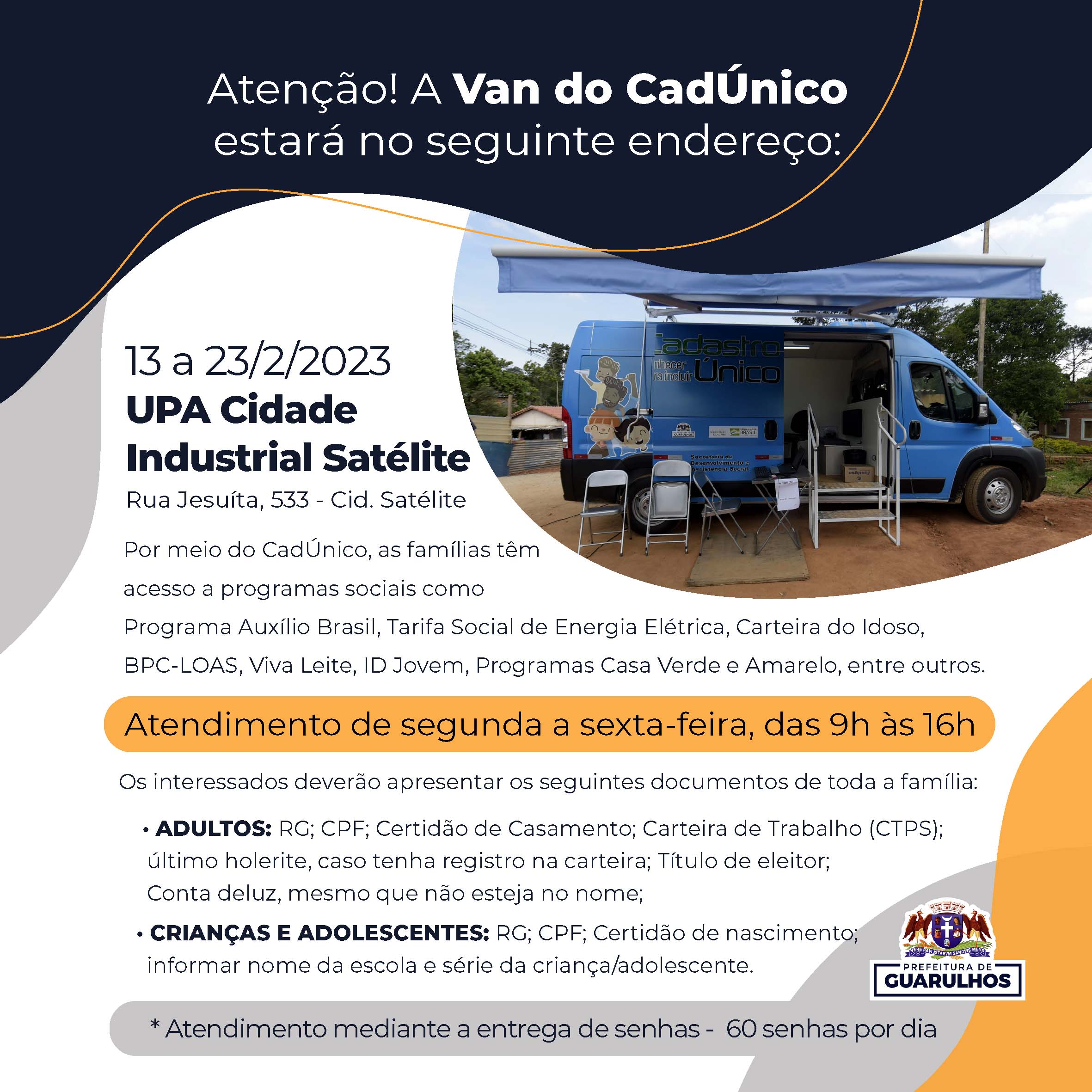 A Van do CadÚnico atenderá a população na UPA Cumbica, instalada na rua dos Jesuítas, 533, entre os dias 13 (segunda-feira) e 23 de fevereiro. No local a população poderá buscar atendimento de segunda a sexta-feira, das 9h às 16h, sendo que diariamente serão entregues 60 senhas aos interessados.