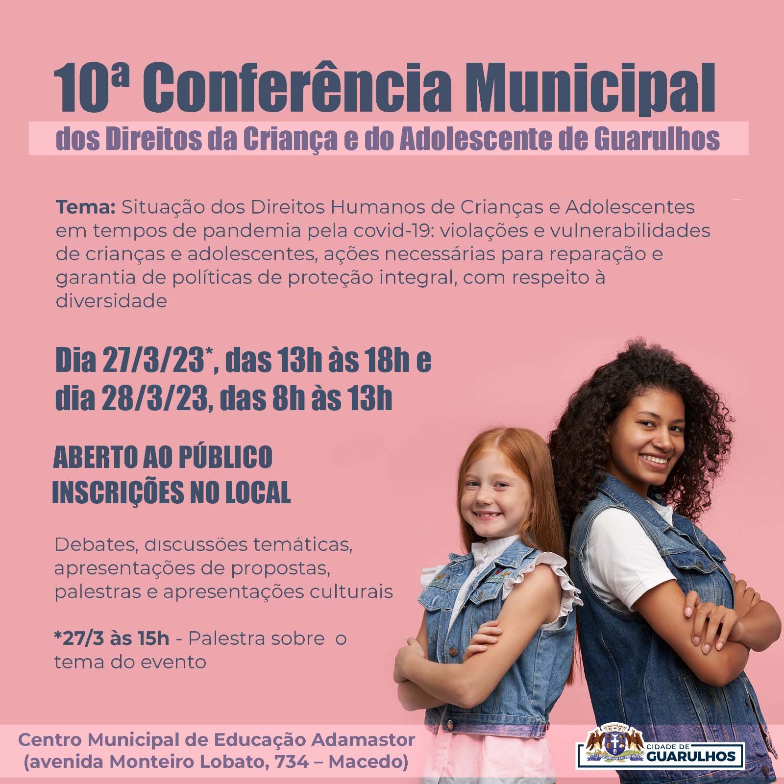 A Prefeitura de Guarulhos promoverá a 10ª Conferência Municipal dos Direitos da Criança e do Adolescente nos próximos dias 27 e 28 de março com uma série de atividades no Adamastor (avenida Monteiro Lobato, 734, Macedo). No dia 27 o evento acontecerá das 13h às 18h, enquanto que no dia 28 será das 8h às 13h.