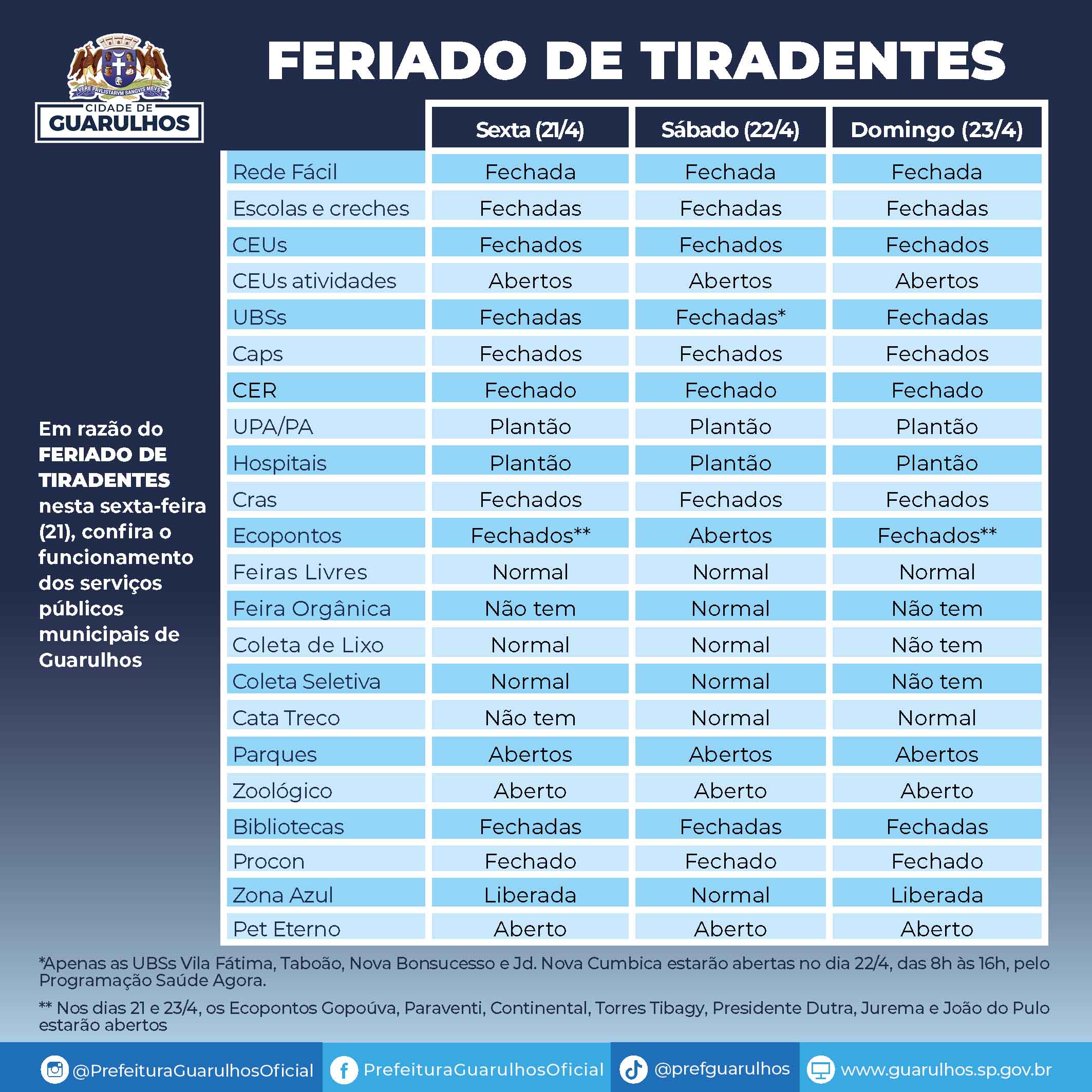 A Prefeitura de Guarulhos divulgou nesta terça-feira (18) como será o funcionamento dos serviços públicos municipais neste final de semana prolongado pelo feriado de Tiradentes nesta sexta-feira (21). A tabela (abaixo) traz as informações dos serviços que sofrerão interrupção e aqueles que funcionarão normalmente ou em regime de plantão.