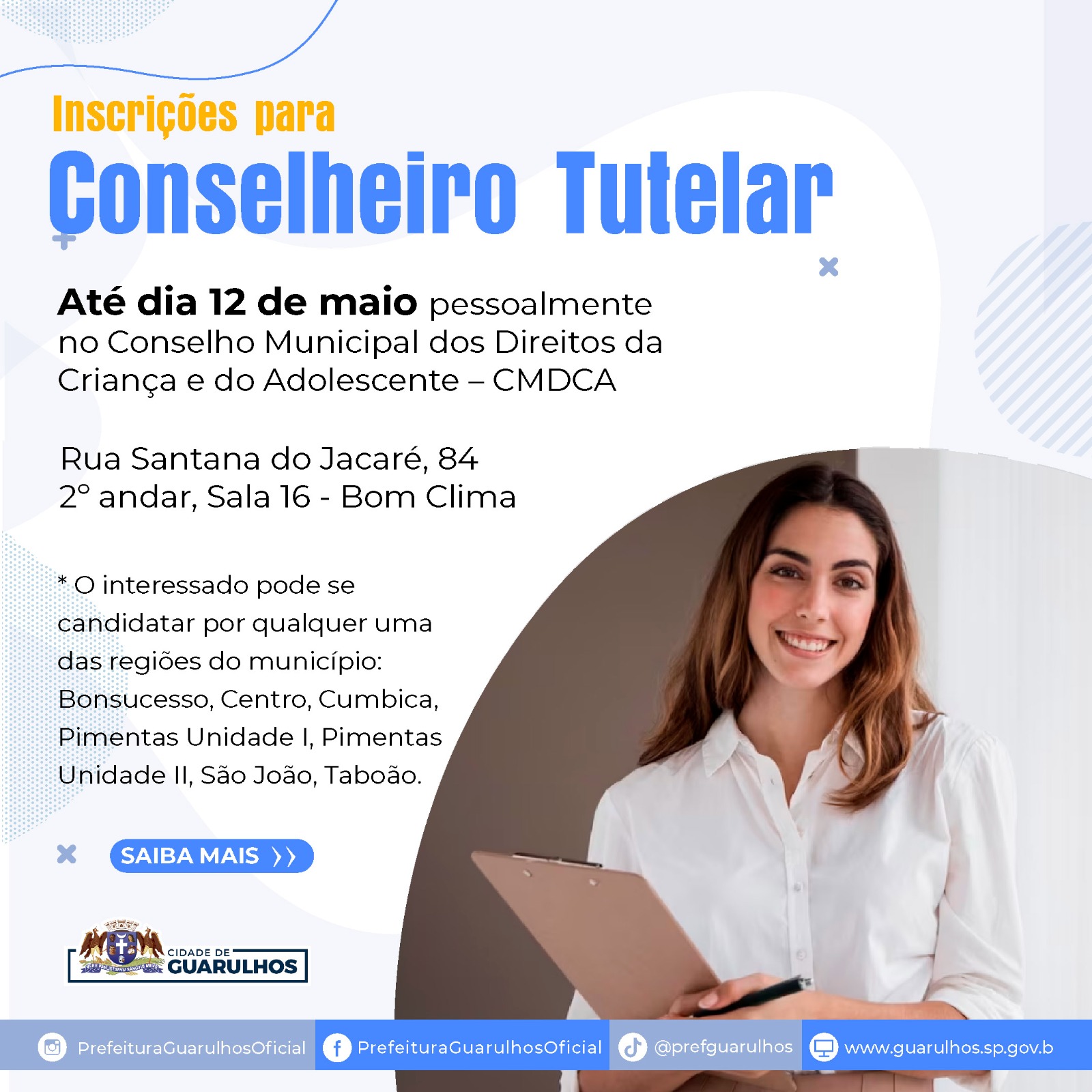 Estão abertas até o dia 12 de maio as inscrições para novos conselheiros tutelares em Guarulhos. São 35 vagas divididas entre as regiões Bonsucesso, Centro, Cumbica, Pimentas Unidade I, Pimentas Unidade II, São João e Taboão e os interessados, desde que preencham todos os requisitos, devem procurar a sede do Conselho Municipal dos Direitos da Criança e do Adolescente (CMDCA), na rua Santana do Jacaré, 84, 2º andar, sala 16, Jardim Bom Clima, para efetuar a inscrição.