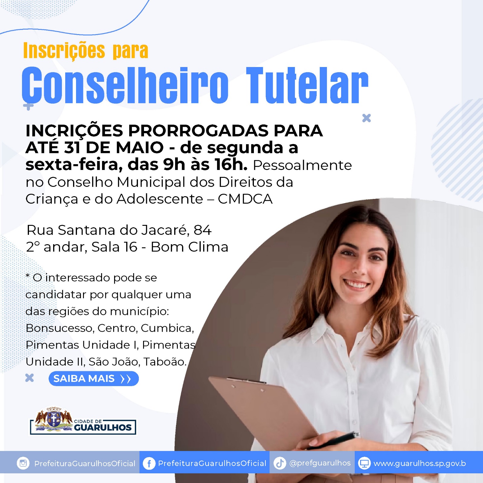 As inscrições para novos conselheiros tutelares em Guarulhos foram prorrogadas para o próximo dia 31 de maio. Os interessados devem procurar a sede do Conselho Municipal dos Direitos da Criança e do Adolescente (CMDCA), na rua Santana do Jacaré, 84, 2º andar, sala 16, no Jardim Bom Clima, de segunda a sexta-feira, das 9h às 16h, para se candidatar.