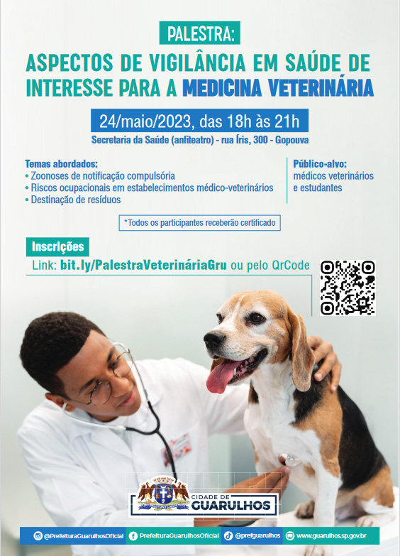 Médicos veterinários e estudantes da área já podem se inscrever para a palestra Aspectos de Vigilância em Saúde de Interesse para a Medicina Veterinária, que irá abordar variados aspectos da vigilância em saúde relacionados ao tema. O encontro será realizado no próximo dia 24 no anfiteatro da Secretaria da Saúde, das 18 às 21h. As inscrições devem ser realizadas pelo link https://bit.ly/PalestraVeterinariaGru.