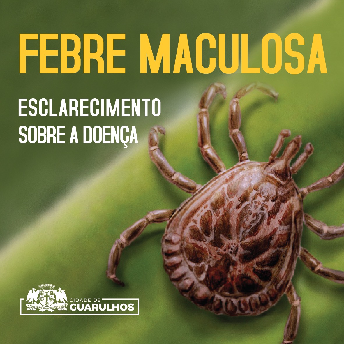 A Prefeitura de Guarulhos esclarece que o município não registrou e nem tem sob investigação casos de febre maculosa, doença transmitida pelo carrapato-estrela e que pode atingir 70% de mortalidade em determinadas situações. Um dos maiores hospedeiros do transmissor da enfermidade é a capivara, mamífero roedor de grande porte.