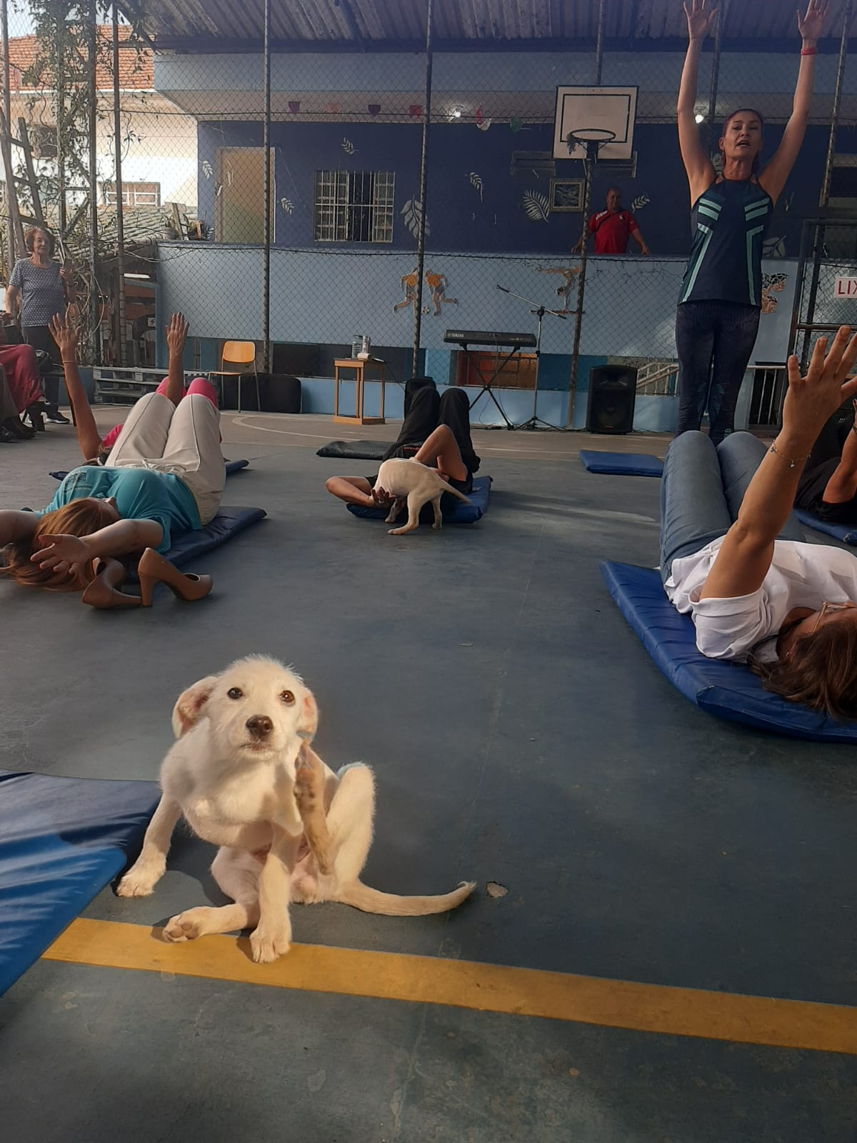 Aula de pilates com filhotes de cachorros movimenta o Centro de Convivência do Idoso Gopoúva