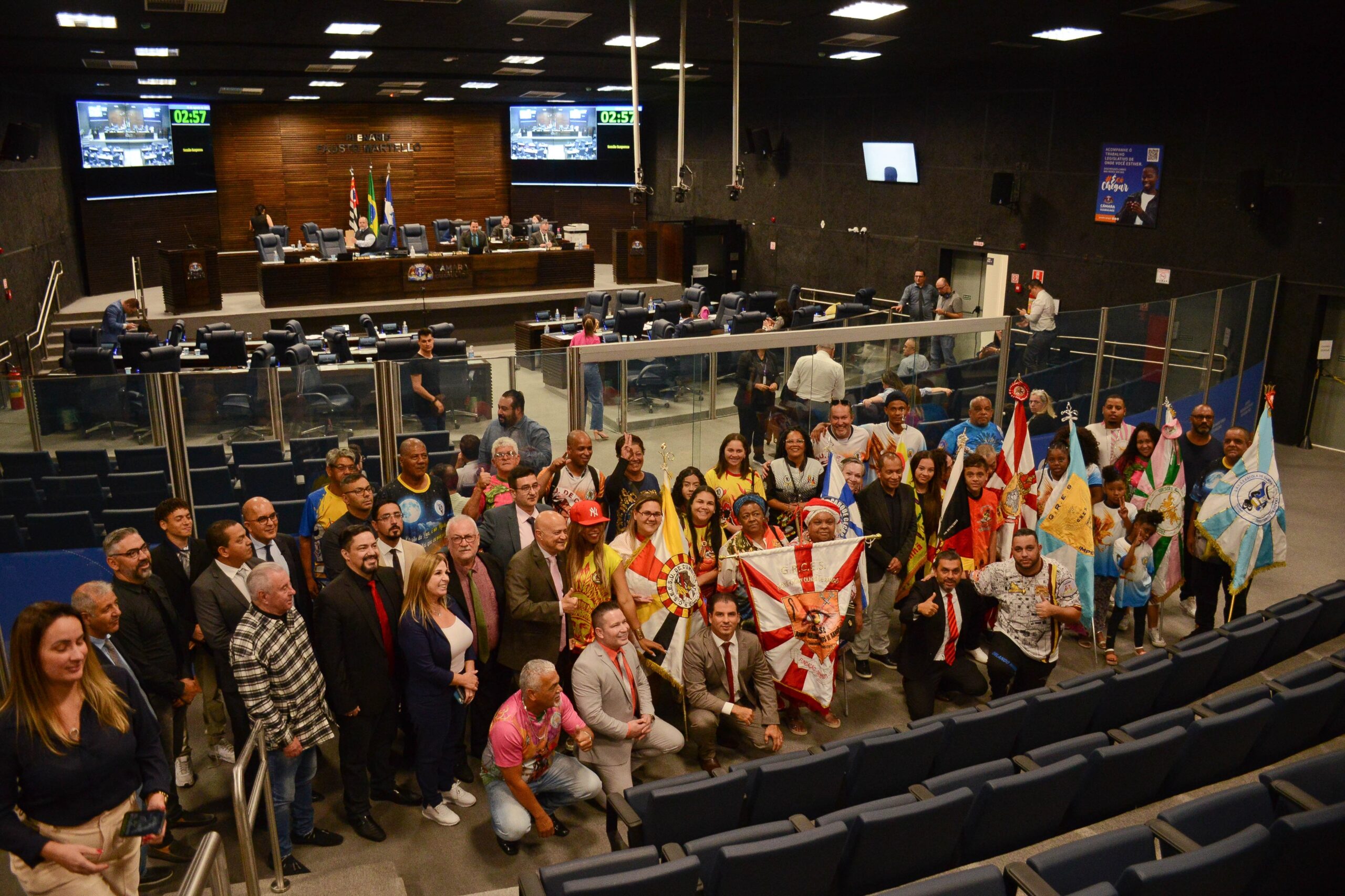A Câmara de Guarulhos votou e aprovou em definitivo, durante Sessão Ordinária realizada na tarde desta quarta-feira, 16/08, cinco Projetos de Lei assinados pelos vereadores. Todos seguem para sanção do prefeito Guti (PSD). Destaque para o PL 680/2023, do presidente da Casa, Ticiano Americano (Cidadania), que institui o Dia para Desfile das Escolas de Samba. Diversos representantes das agremiações compareceram à Câmara para acompanhar a votação e comemoraram o resultado.