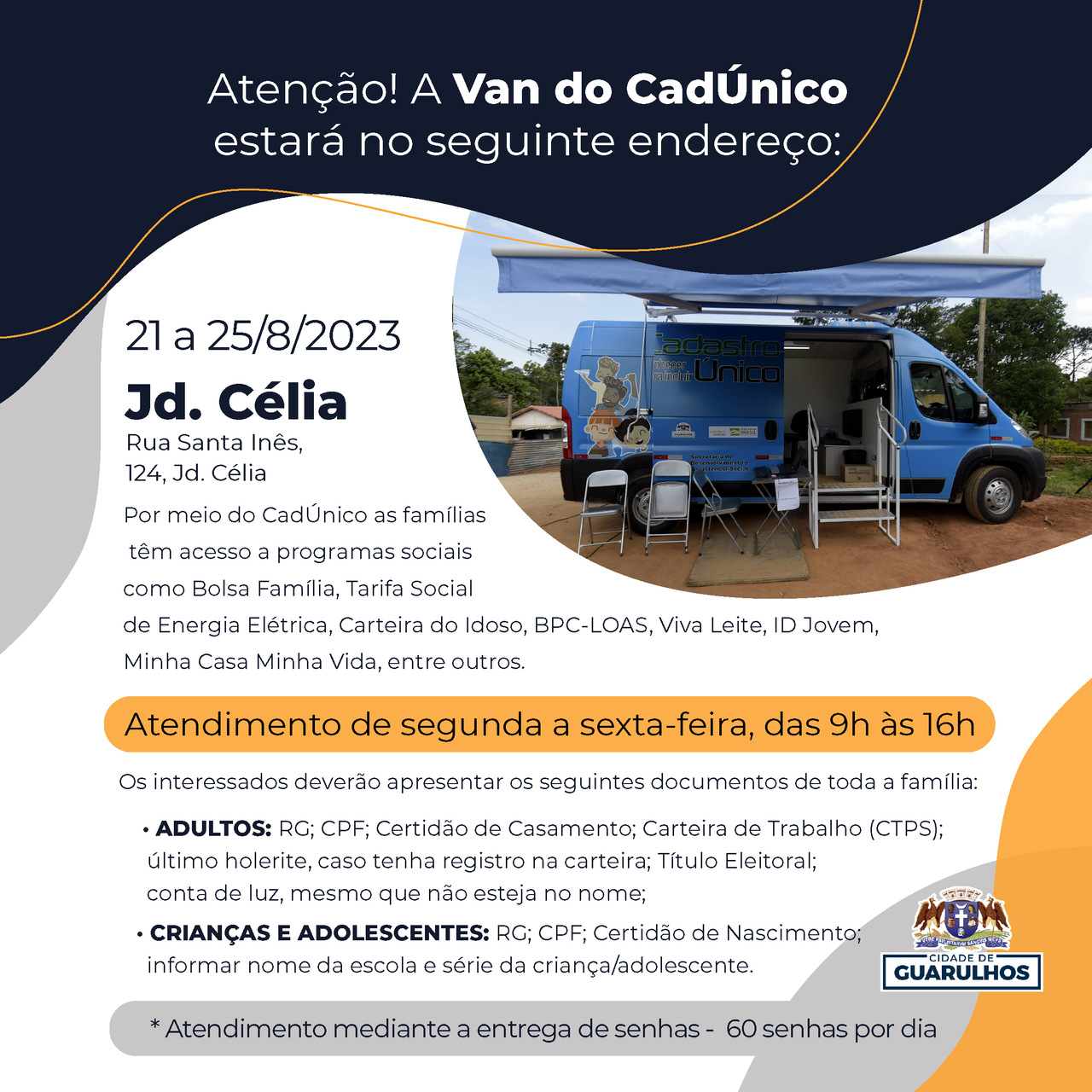 A Van do CadÚnico atenderá no Jardim Célia entre os dias 21 e 25 de agosto. O equipamento de reforço do serviço de busca ativa da Prefeitura de Guarulhos estará estacionado na rua Santa Inês, 124, e atenderá a população de segunda a sexta-feira, das 9h às 16h.