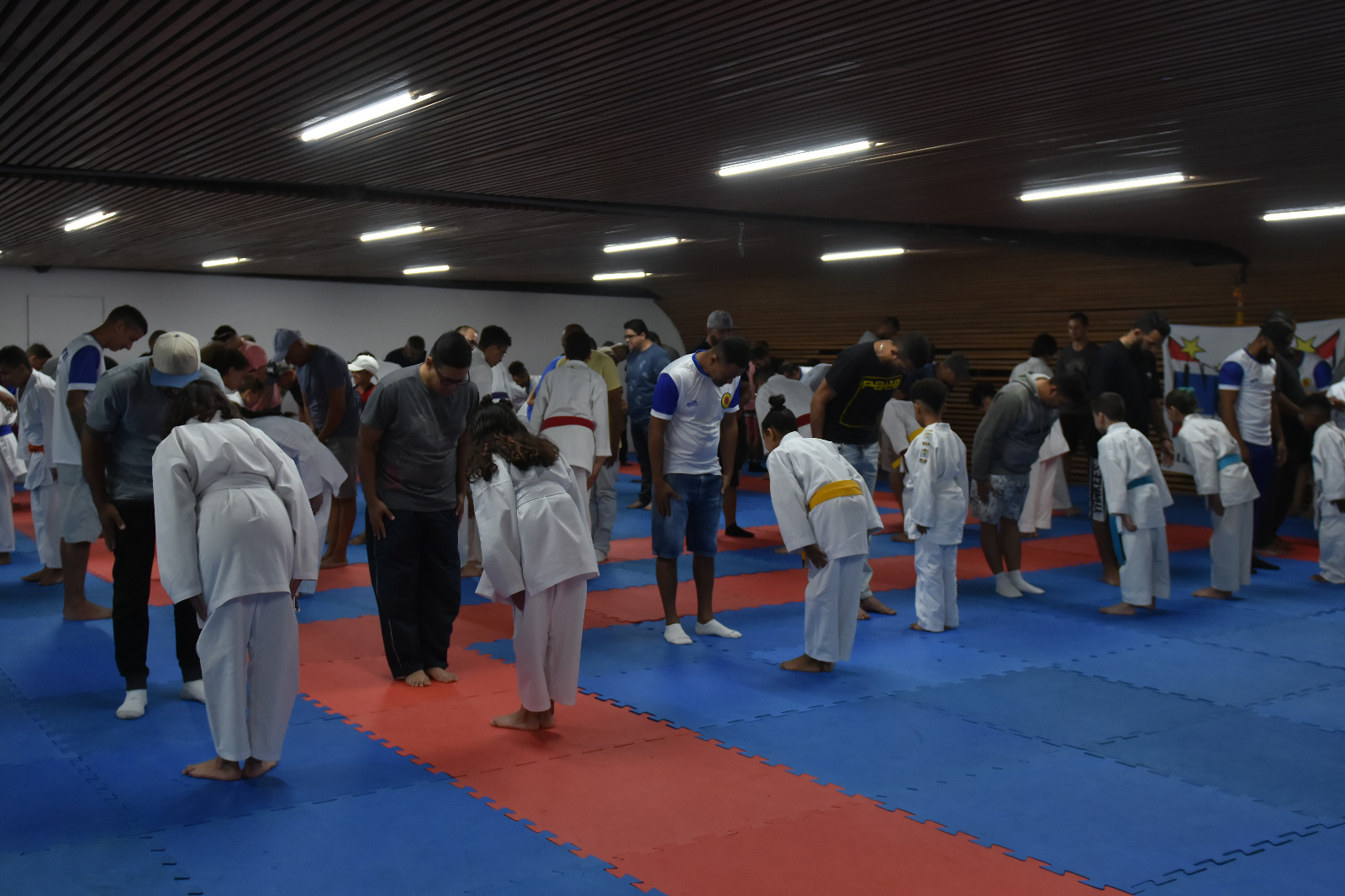 No último sábado (19) os alunos do programa Iniciação Esportiva, da Prefeitura de Guarulhos, participaram de um evento em homenagem ao Dia dos Pais no CEU Pimentas. Cerca de cem pessoas, entre alunos e familiares, realizaram atividades de caratê.