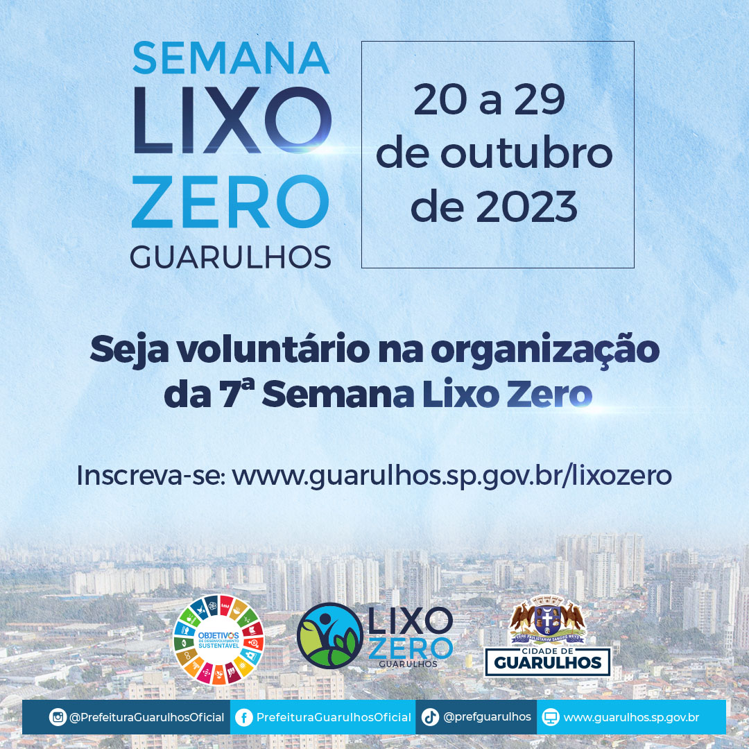 Estão abertas até dia 10 de outubro, na página www.guarulhos.sp.gov.br/lixozero/semana-lixo-zero, as inscrições para participação na edição 2023 da Semana Lixo Zero Guarulhos. Podem participar todas as pessoas, empresas e associações que tenham alguma ação relacionada à limpeza ambiental para integrar a programação do evento, que será realizado entre os dias 20 e 29 de outubro em mais de cem cidades brasileiras com o tema acordo social.