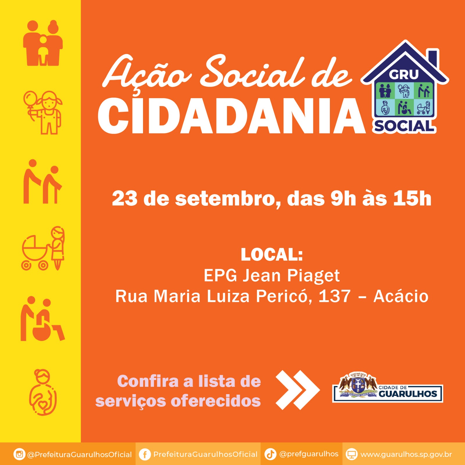 A próxima edição do GRU Social acontecerá no dia 23 de setembro, das 9h às 15h, na EPG Jean Piaget, instalada na rua Maria Luiza Pericó, 137, no Jardim Acácio. Trata-se de uma ação que oferece gratuitamente uma extensa lista de serviços que podem ser usufruídos pela população da região sem a necessidade de agendamento.