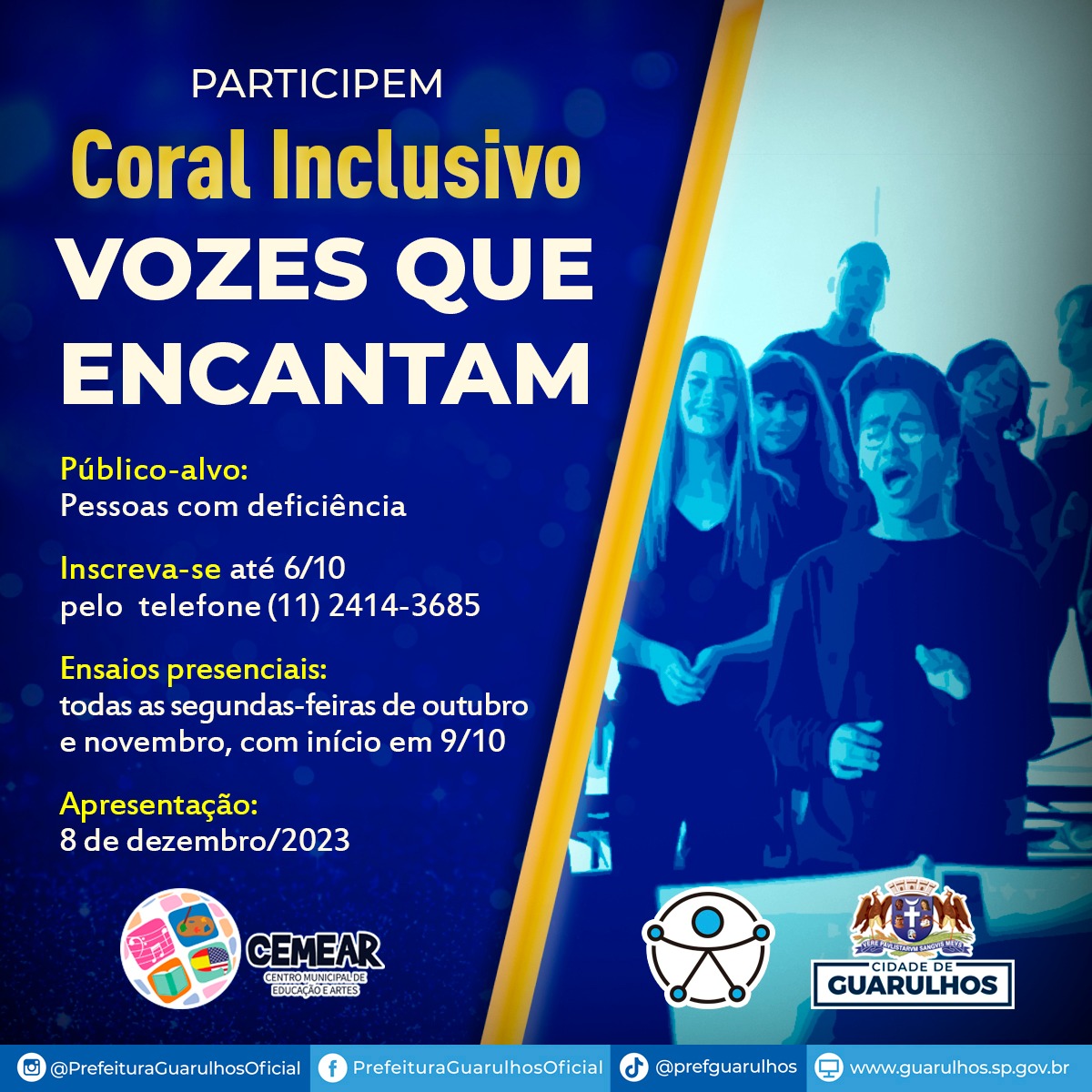 Pessoas com deficiência, seus acompanhantes e familiares podem se inscrever até sexta-feira (6) para participar do coral inclusivo “Vozes que Encantam”, que a Subsecretaria de Acessibilidade e Inclusão está criando com o apoio do maestro Fábio Bonvenuto, do Centro Municipal de Educação e Artes (Cemear). As inscrições devem ser feitas pelo telefone (11) 2414-3685.