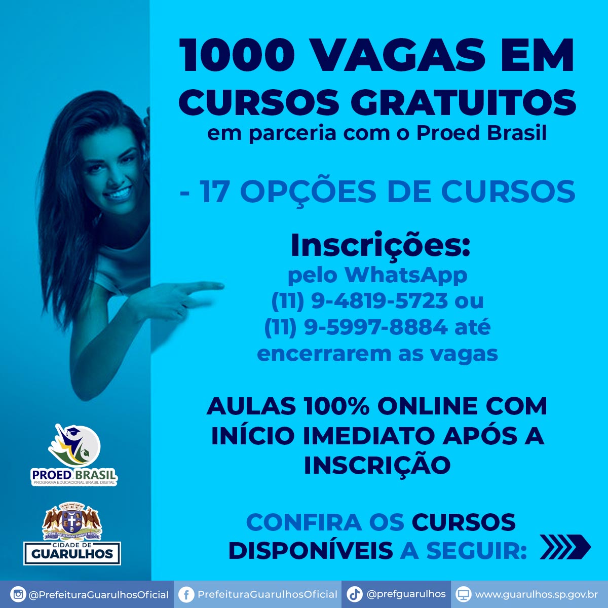 A Prefeitura de Guarulhos recebe a partir desta quarta-feira (11) inscrições para mais de mil vagas em 17 opções de cursos gratuitos, em parceria com a empresa Proed Brasil. As inscrições seguem enquanto houver vagas disponíveis e devem ser feitas por WhatsApp (11) 9-4819-5723 ou (11) 9-5997-8884.