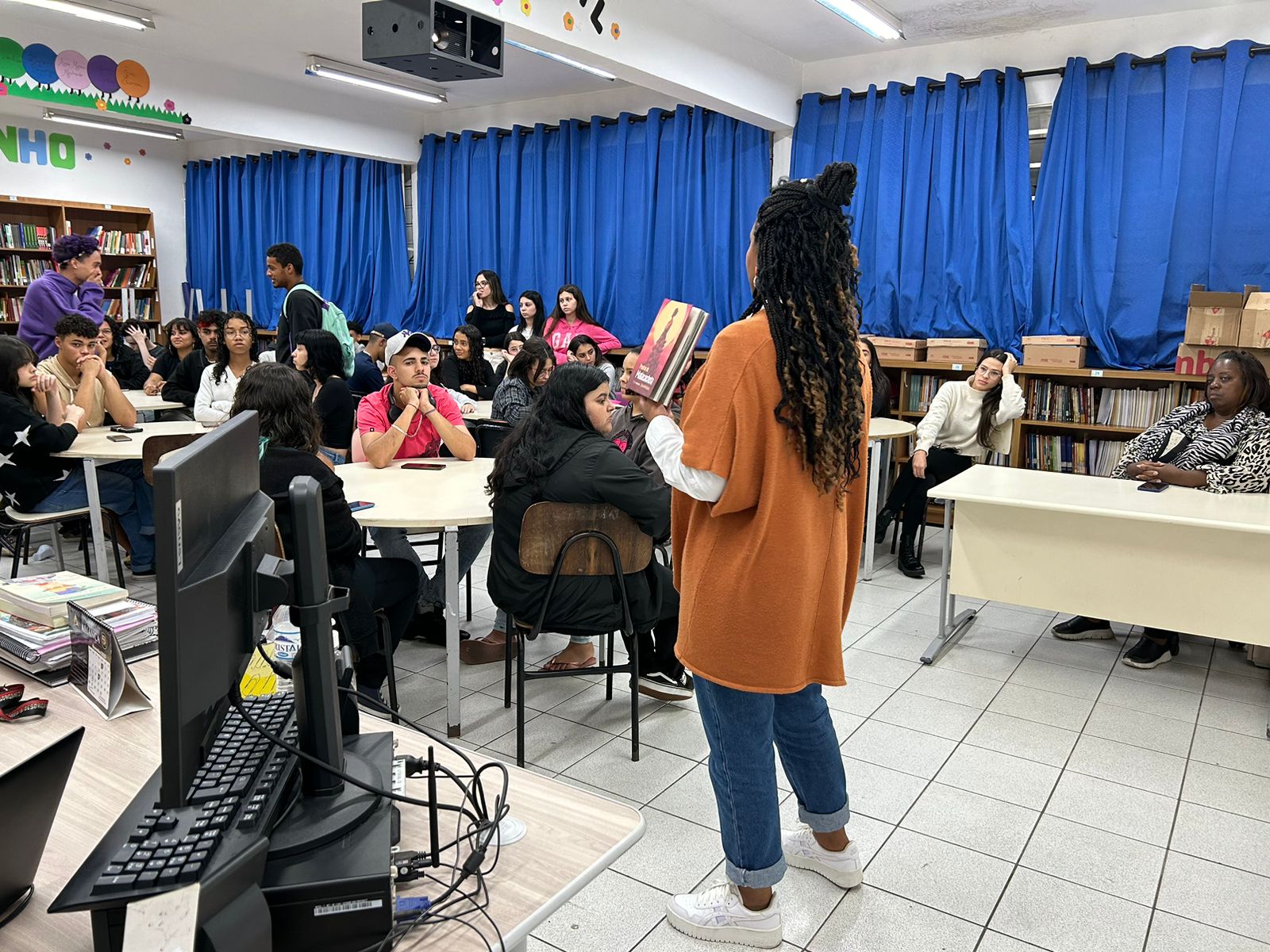 Dentro da programação do Novembro Negro GRU 2023, a Subsecretaria da Igualdade Racial (SIR), por meio de seu núcleo técnico de formação, promoveu na quinta-feira (26) a exposição “Mulheres e homens que mudaram a história” e palestra sobre a importância das cotas para egressos de escola publica aos alunos da Escola Estadual Professora Salime Mudeh, no Jardim São João.