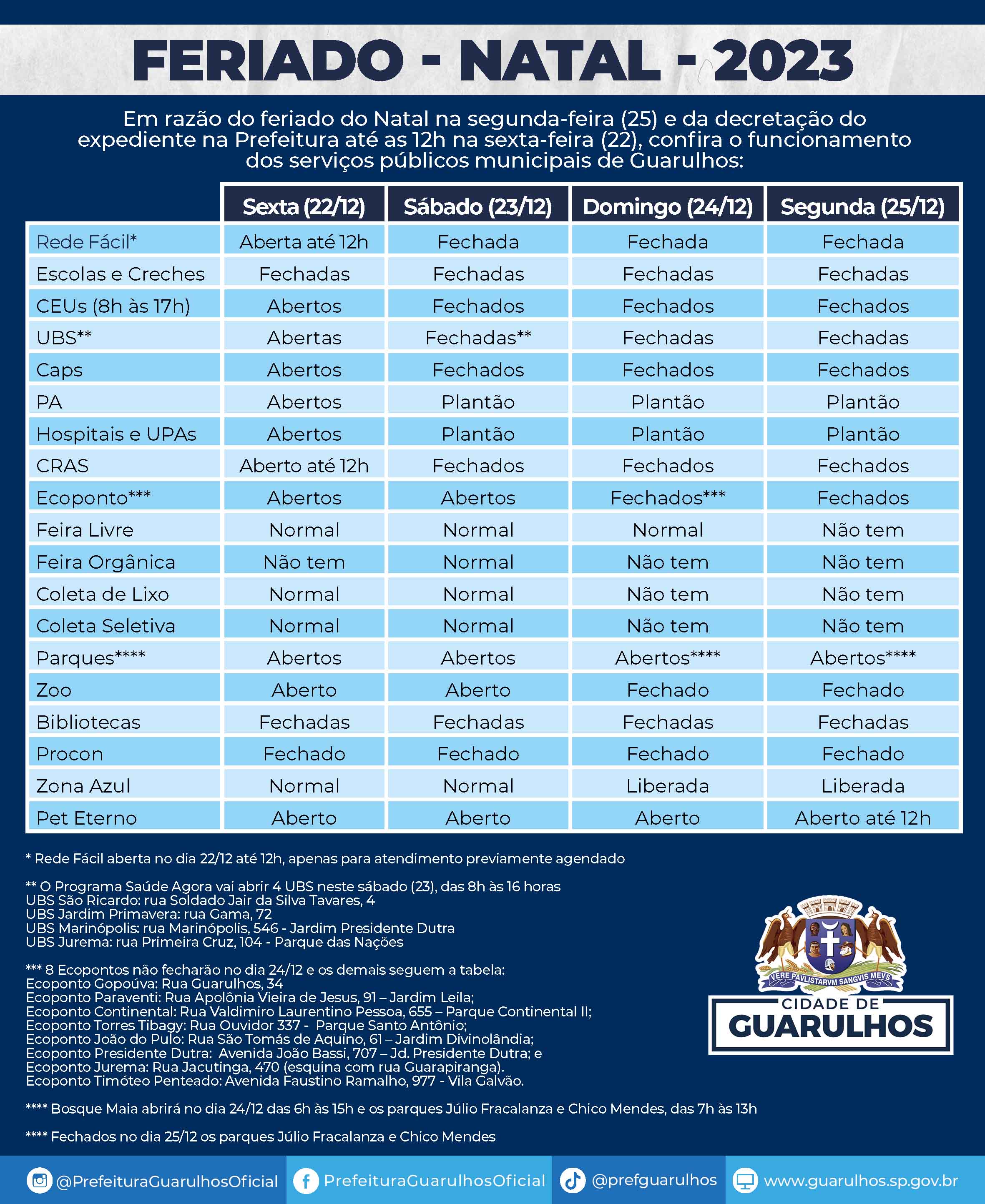 Em razão do feriado do Natal na segunda-feira (25) e da decretação do expediente na Prefeitura até as 12h na sexta-feira (22), confira o funcioname