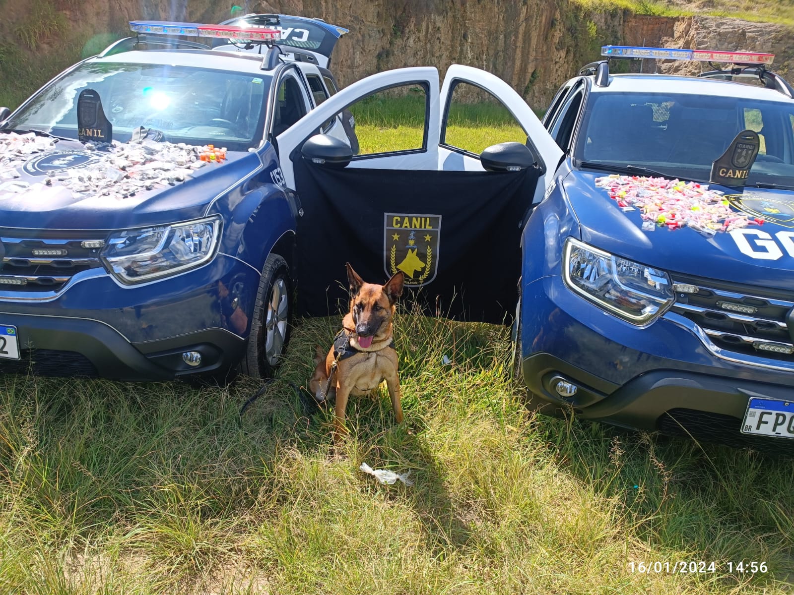 Os agentes realizavam patrulhamento preventivo na região, rondando unidades de saúde e escolares, quando depararam com um homem que, ao avistar a viatura, se embrenhou na mata e conseguiu fugir. Mas, com a ajuda do cão policial e farejador Ventania, a sacola contendo as substâncias foi localizada no matagal.
