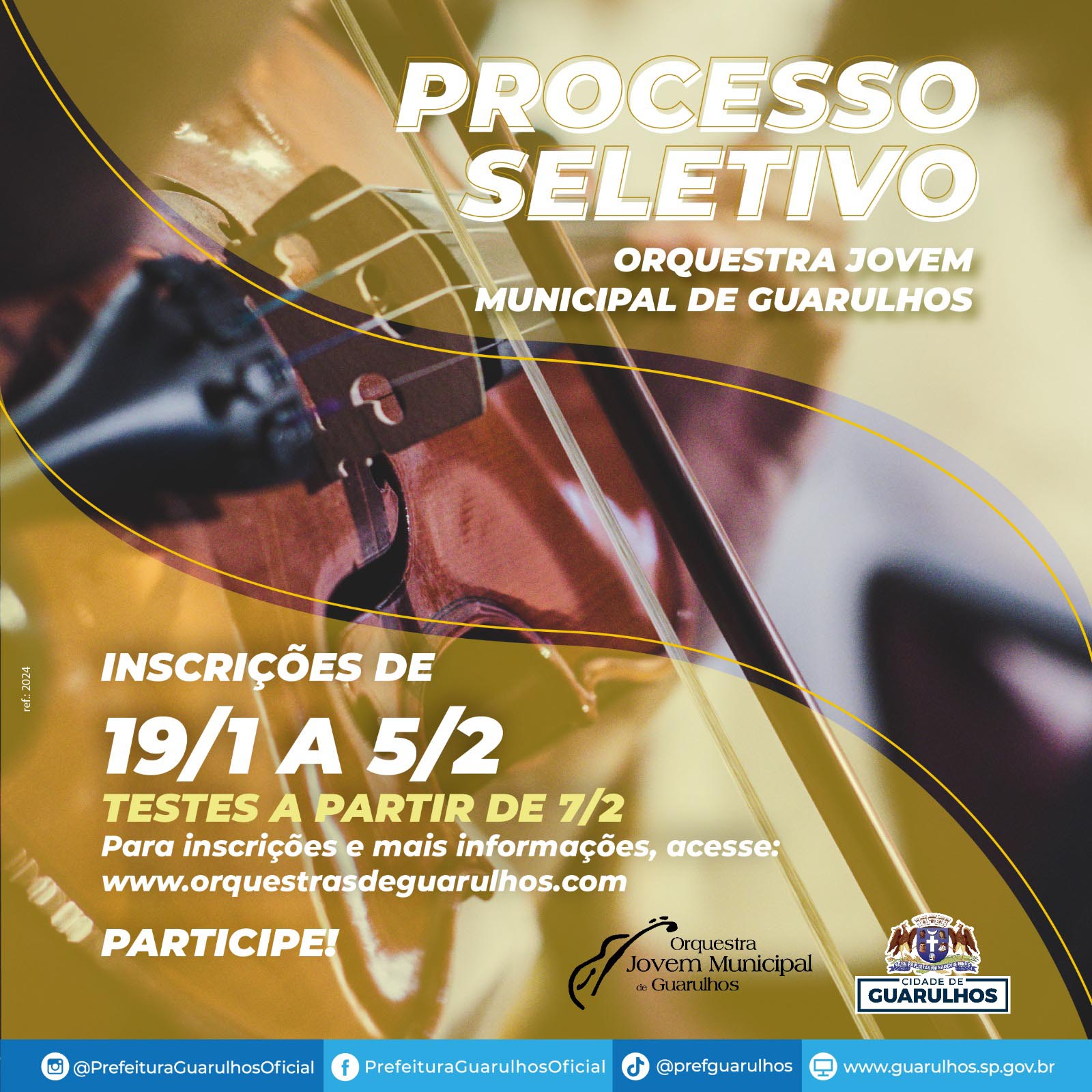 A Secretaria de Cultura receberá entre os dias 19 de janeiro e 5 de fevereiro as inscrições de músicos interessados em integrar a Orquestra Jovem de Guarulhos. Para participar do processo seletivo é necessário preencher o formulário no portal http://orquestrasdeguarulhos.com/, anexar cópias do RG e CPF ou CNH, comprovante de residência e uma declaração de professor ou de instituição de ensino que comprove que o candidato está estudando música de forma regular. No mesmo site é possível conferir o edital completo.