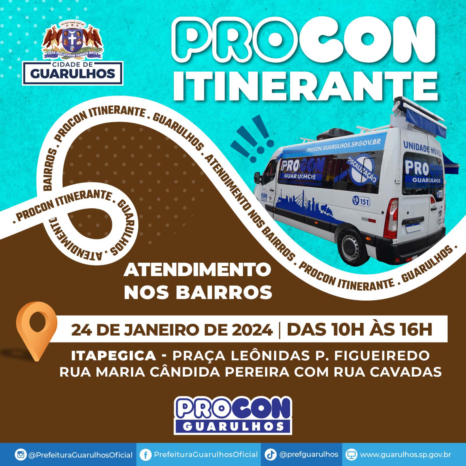 Nesta quarta-feira (24) a unidade móvel do Procon Guarulhos estará na praça Leônidas P. Figueiredo (entre as ruas Maria Cândida Pereira e Cavadas), no Itapegica, para atender a população das 10h às 16h. O veículo da Coordenadoria de Defesa e Proteção do Consumidor de Guarulhos leva semanalmente a um bairro do município os mesmos serviços prestados nas unidades do Procon.