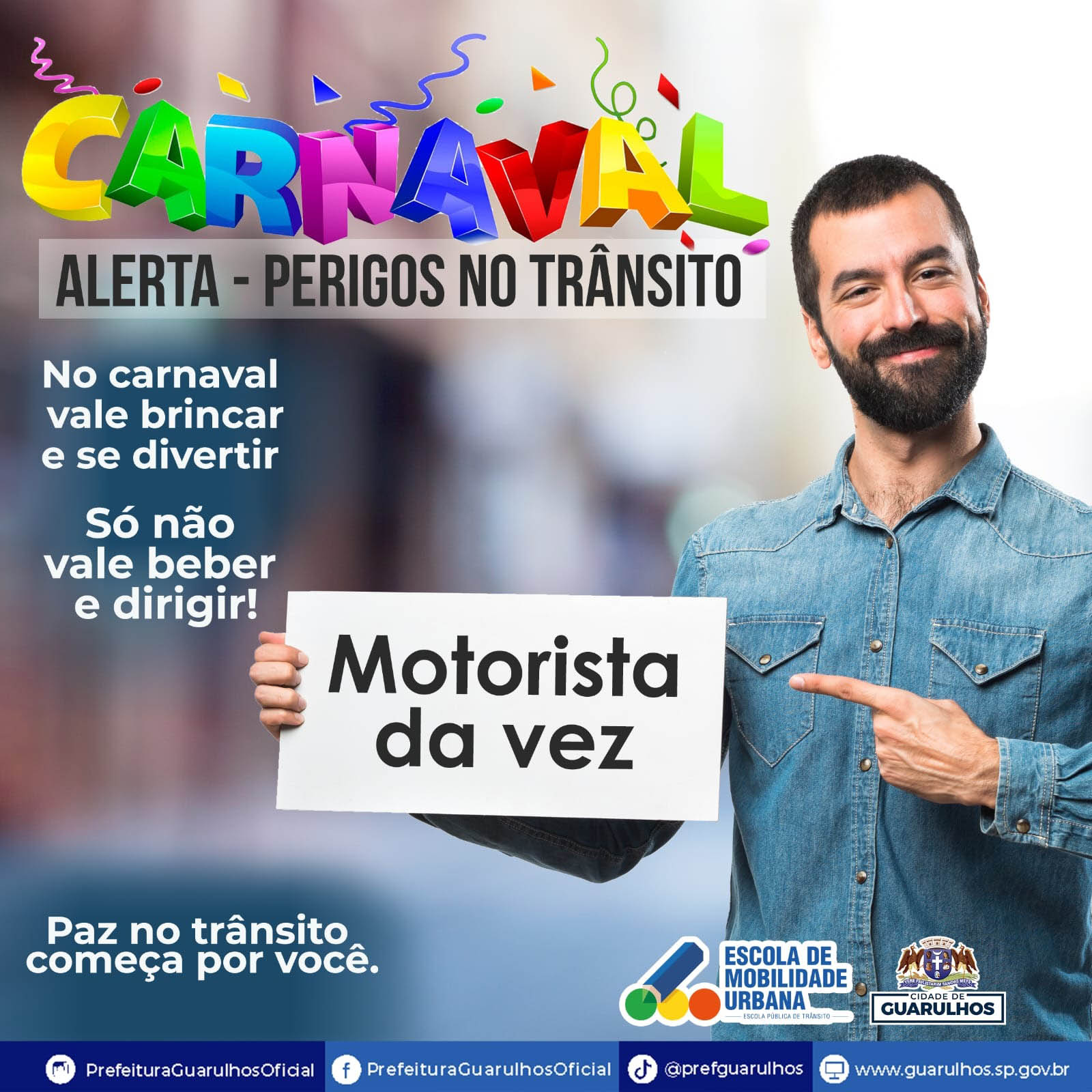 A maior festa popular do Brasil, o carnaval, já começou. Guarulhos, assim como muitos municípios do país, vai contar com diversos blocos para animar o cidadão. Com o objetivo de incentivar os foliões a aproveitarem a festa com responsabilidade, a Prefeitura, por meio da Escola de Mobilidade Urbana, iniciou uma campanha de conscientização em suas redes sociais voltada à segurança no trânsito.