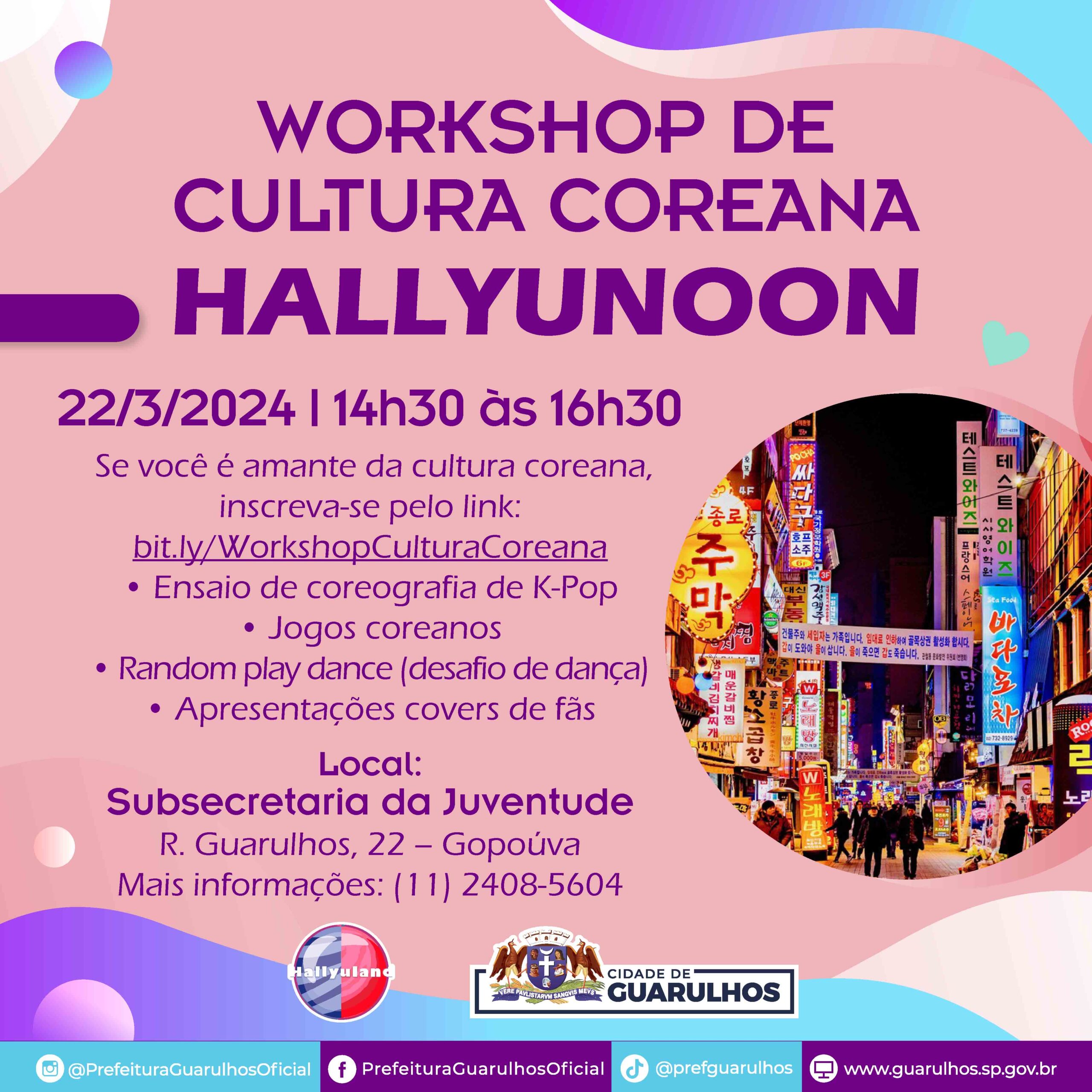 Os amantes da cultura coreana já podem se inscrever para participar de um workshop gratuito criado pela produtora Hallyuland, que vai acontecer no próximo dia 22 (sexta-feira), das 14h30 às 16h30, na Subsecretaria da Juventude (rua Guarulhos, 22, Gopoúva). As inscrições devem ser feitas pelo link bit.ly/WorkshopCulturaCoreana.
