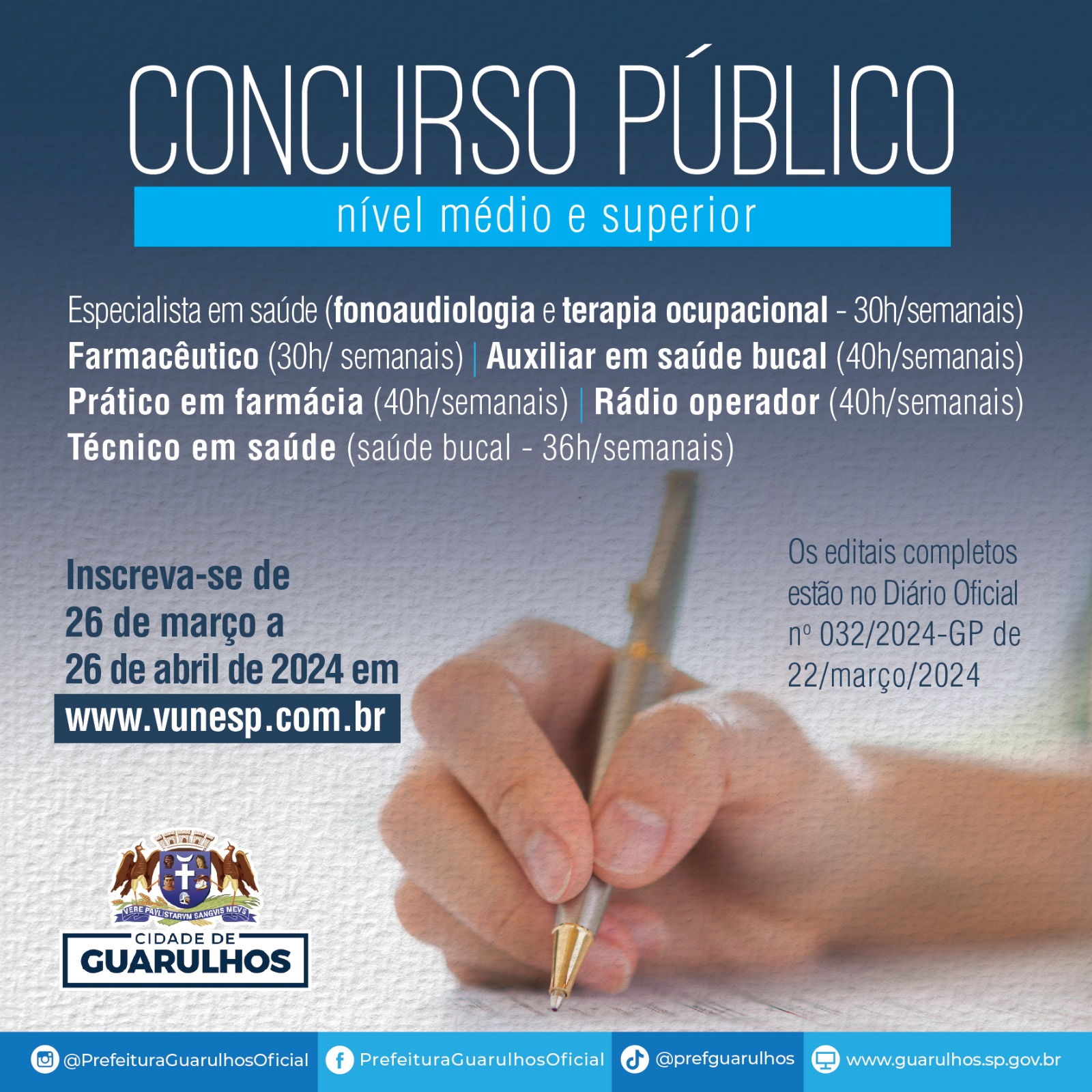 A Prefeitura de Guarulhos abriu concurso público para sete funções, do ensino médio completo ao superior: especialista em saúde (fonoaudiologia – 30 horas semanais), especialista em saúde (terapia ocupacional – 30 horas semanais), farmacêutico (30 horas semanais), auxiliar em saúde bucal (40 horas semanais), prático em farmácia (40 horas semanais), operador de rádio (40 horas semanais) e técnico em saúde bucal (36 horas semanais). As inscrições devem ser feitas pelo site da Fundação Vunesp (www.vunesp.com.br) a partir desta terça-feira (26) até o dia 26 de abril.
