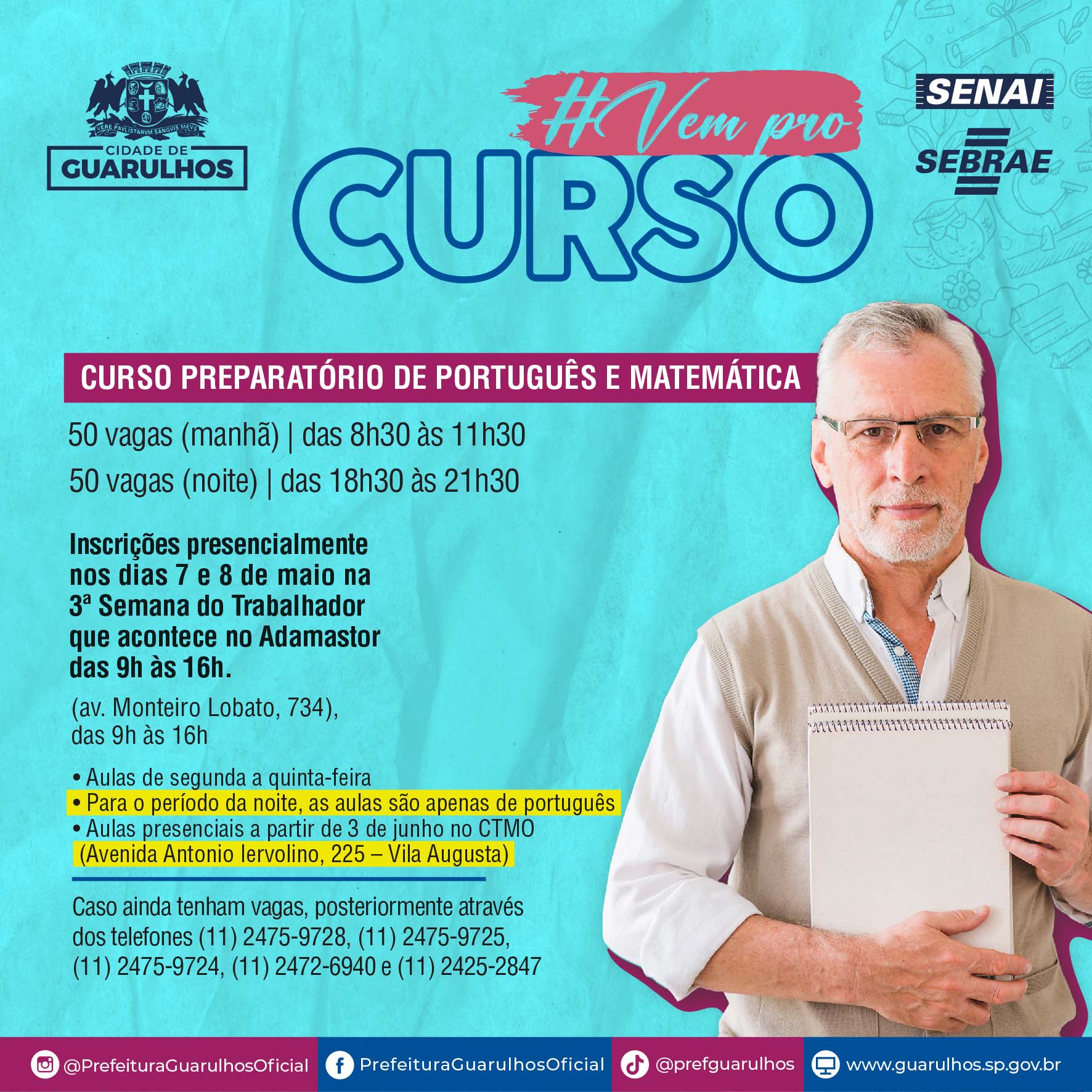 Os interessados, desde que maiores de 16 anos e com o ensino fundamental completo, deverão realizar as inscrições presencialmente nos dias 7 e 8 de maio na 3ª Semana do Trabalhador, que acontece no Adamastor (avenida Monteiro Lobato, 734, Macedo) das 9h às 16h e, caso ainda restem vagas, posteriormente pelos telefones (11) 2475-9728, (11) 2475-9725, (11) 2475-9724, (11) 2472-6940 ou (11) 2425-2847.