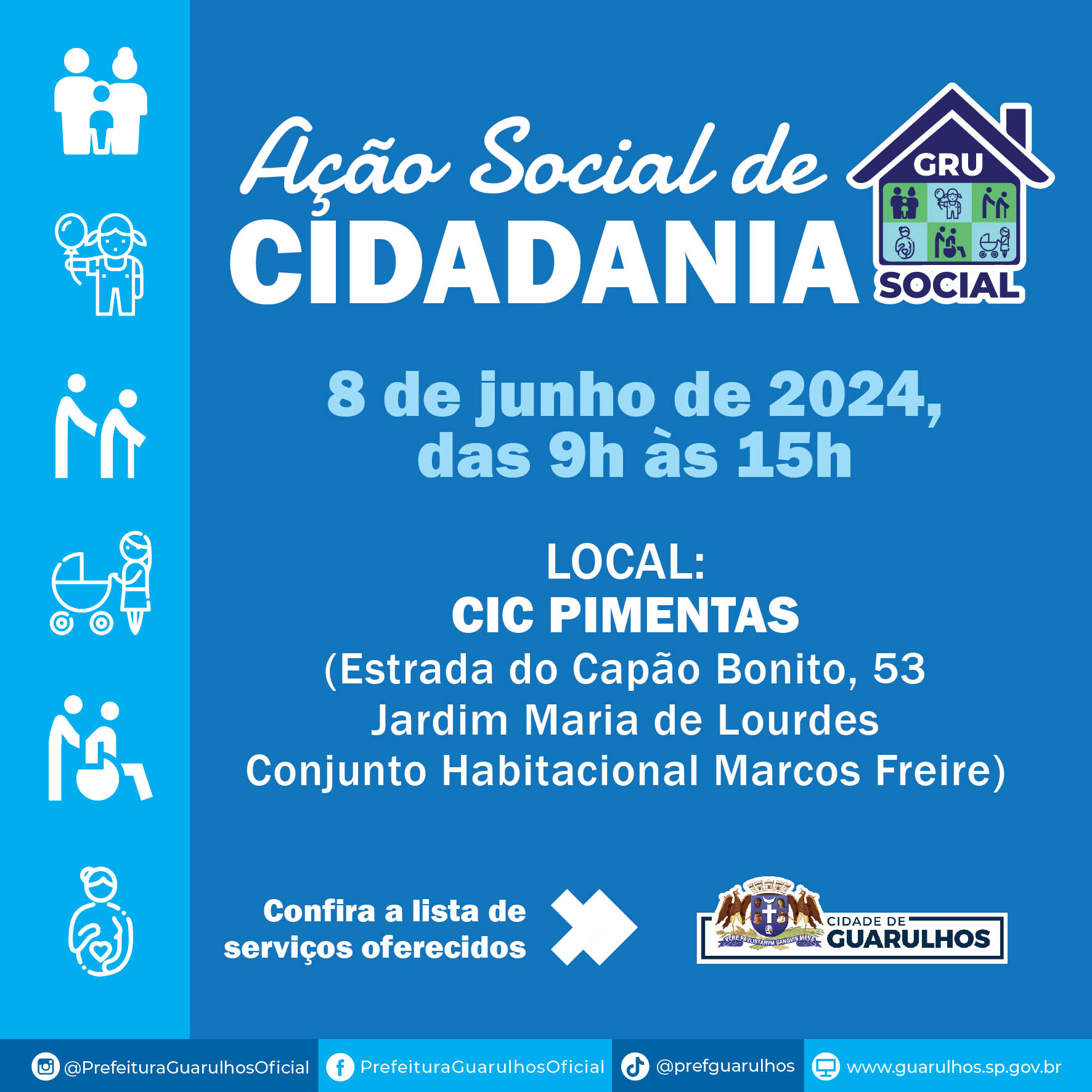 A próxima edição do GRU Social, ação de solidariedade da Prefeitura de Guarulhos, acontece no próximo sábado (8), das 9h às 15h, no CIC Pimentas, na estrada do Capão Bonito, 53, no Jardim Maria de Lourdes. O evento oferece uma série de serviços gratuitos à população, como solicitações de serviços municipais, inscrições em cursos de qualificação profissional, busca por vagas de emprego, serviços de beleza, entre outros.