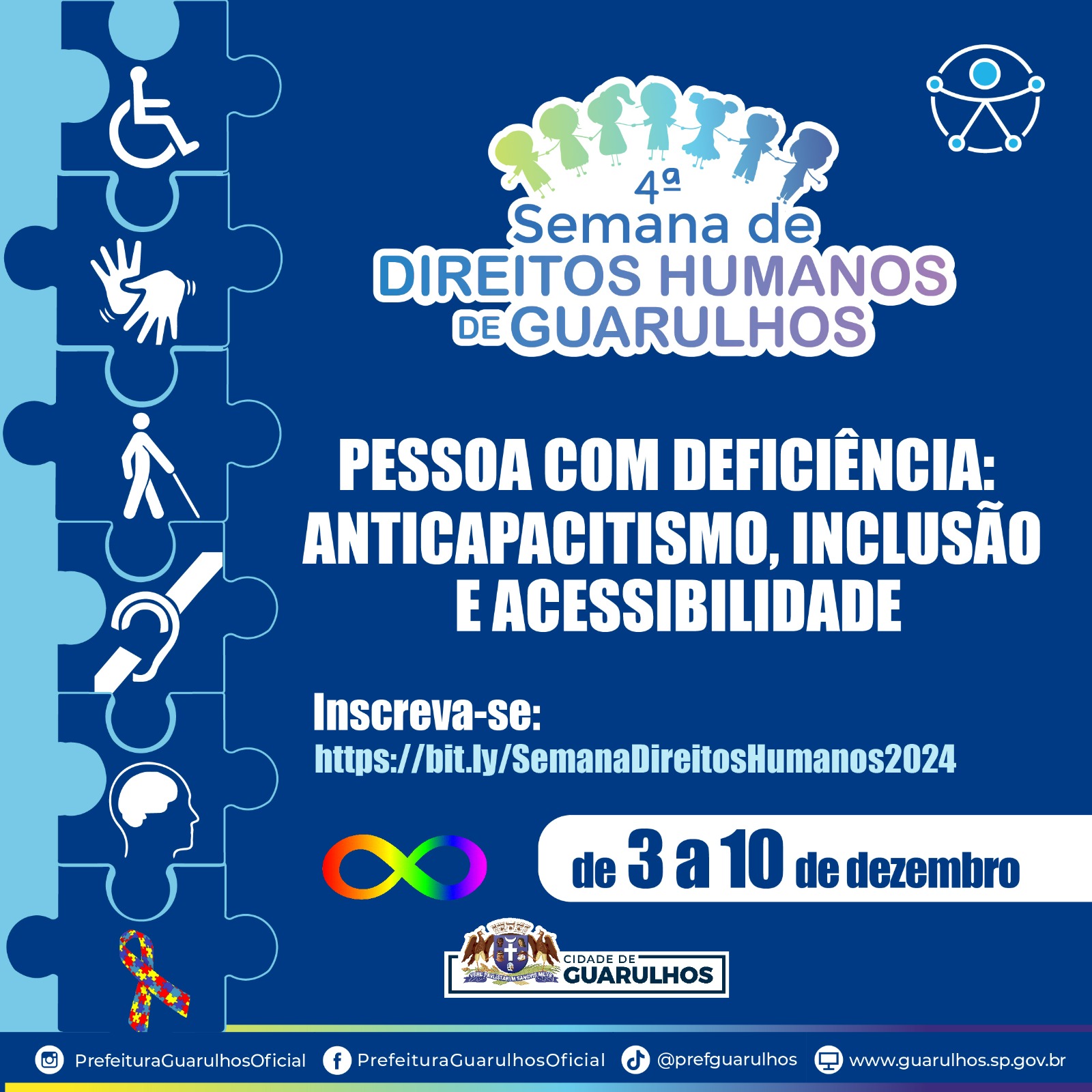 De 3 a 10 de dezembro a Prefeitura de Guarulhos promoverá a 4ª Semana de Direitos Humanos, neste ano com o tema “Pessoa com Deficiência: Anticapacitismo, Inclusão e Acessibilidade”, com a realização de 70 atividades culturais e artísticas gratuitas espalhadas por várias regiões da cidade.