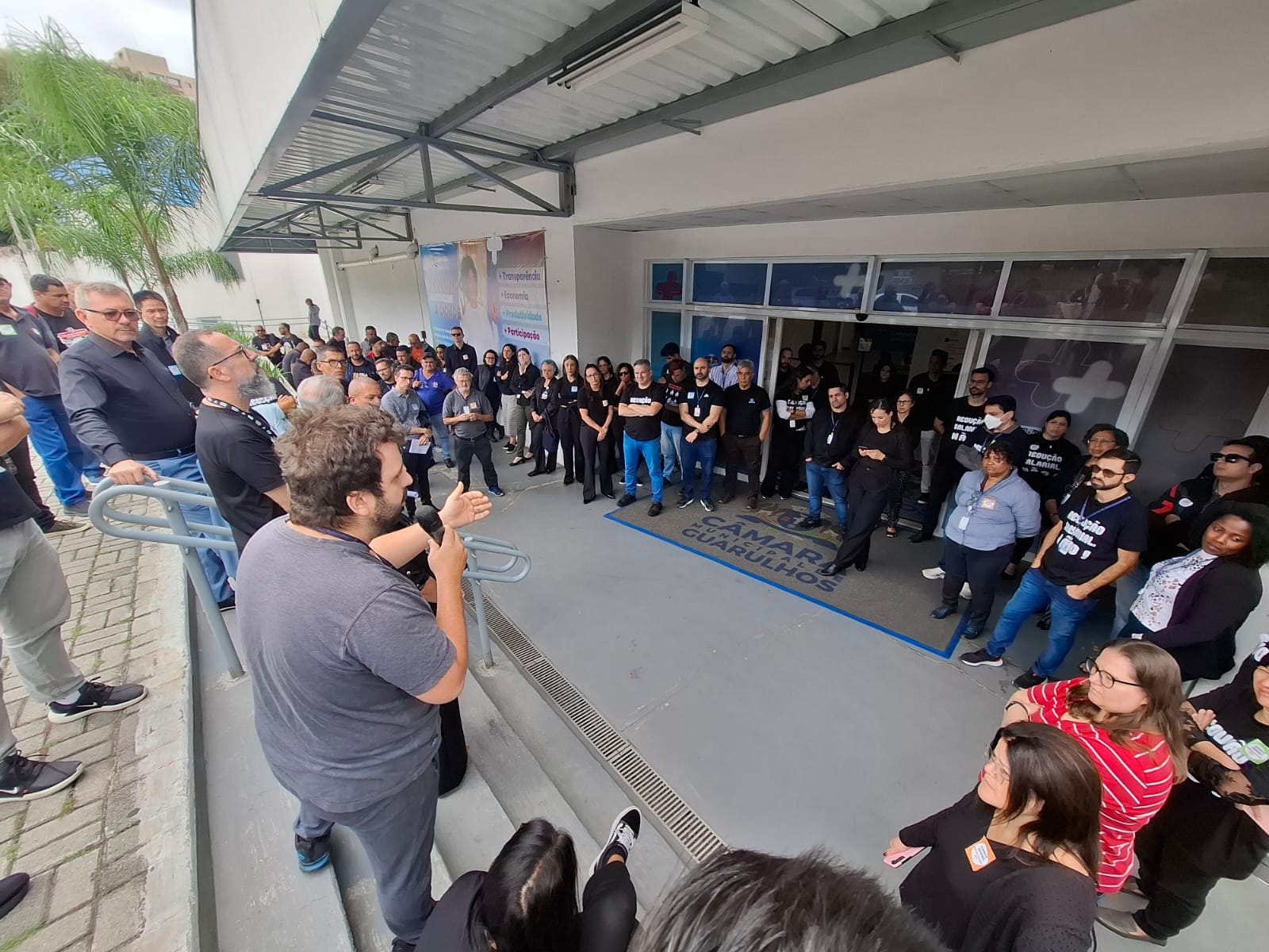 Funcionários da Câmara Municipal se reuniram na manhã desta segunda-feira (07) para discutir uma reforma administrativa que, segundo o senhor Juliano, presidente do Sindicato dos servidores do Legislativo de Guarulhos, pode diminuir alguns salários de servidores concursados e poderá retirar vale alimentação e de vales-transportes de concursados e de funcionários de livre nomeação. O projeto apresentado pela Mesa da Camara visa atender determinação do Tribunal de Justiça de São Paulo. O Tribunal entendeu que algumas leis promulgadas não estavam de acordo com a legislação vigente. Isso é contestado pelo sindicato que entendem ser inconstitucional o que foi determinado pela Justiça.